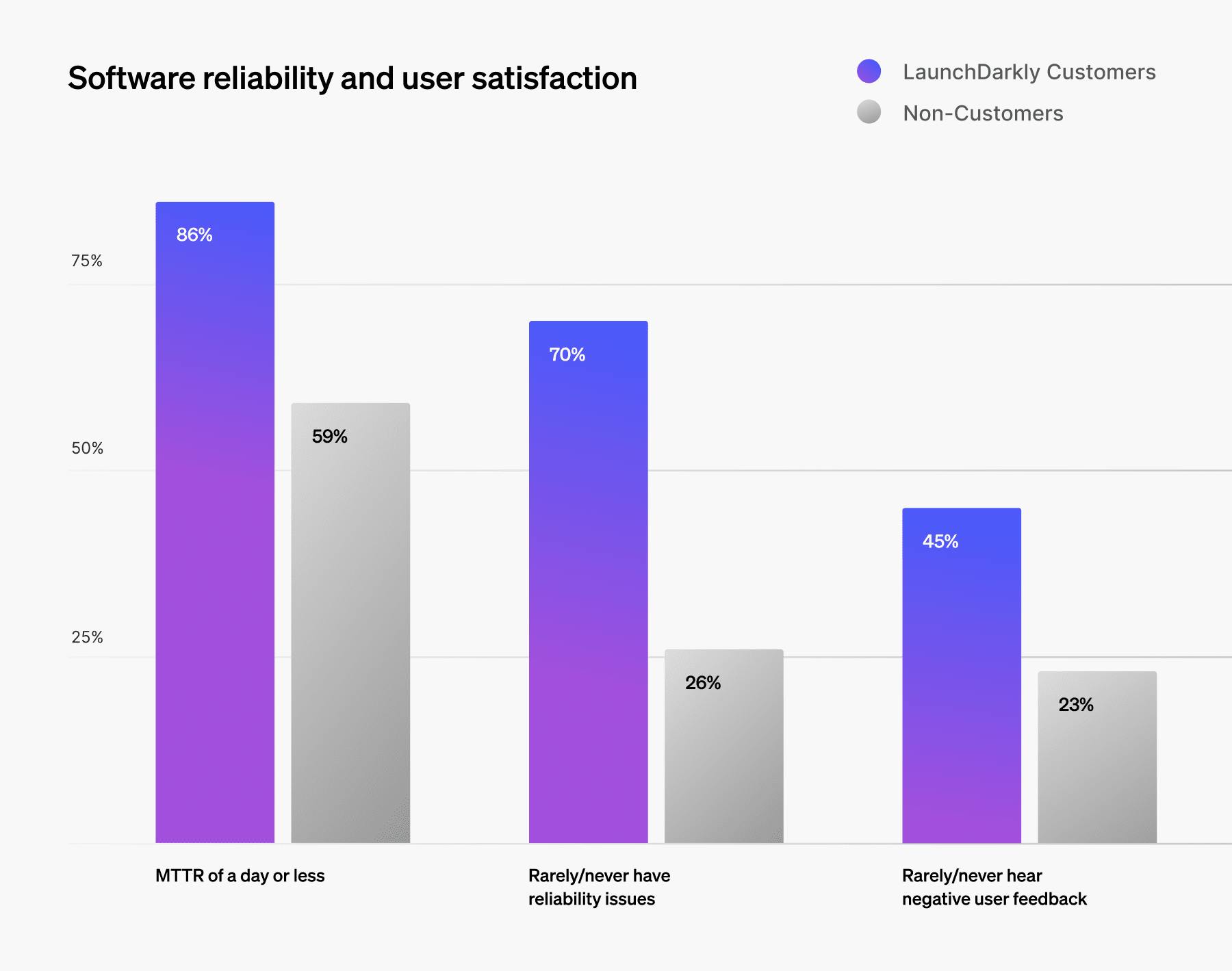 The survey results demonstrate the benefits of using LaunchDarkly's feature management and experimentation platform: customers have a high developer innovation velocity, recover faster, experience greater software reliability, foster high customer satisfaction, and maintain low overhead when releasing and managing software.