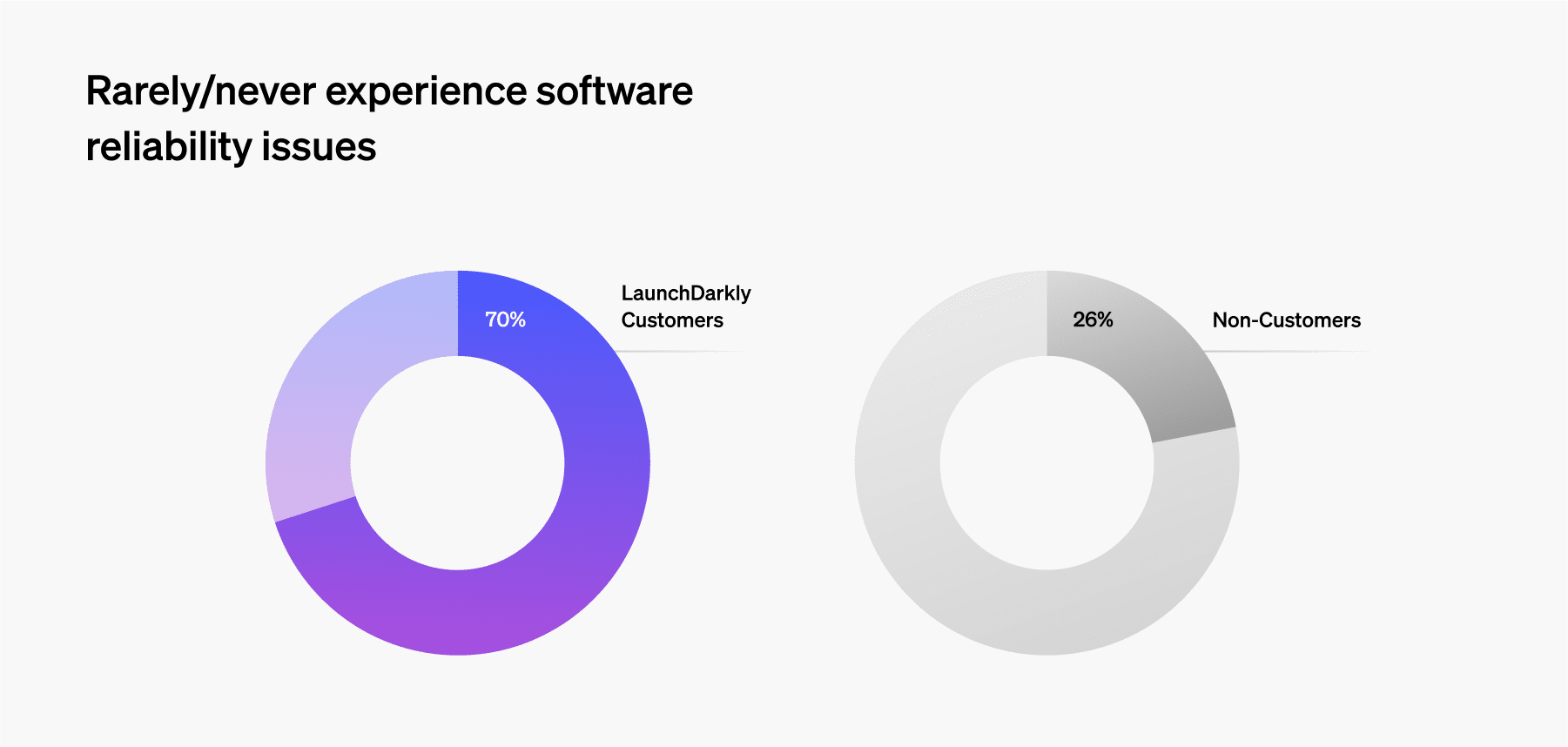 Similarly, only 26% of non-customers rarely or never experience reliability issues. Whereas, 70% of LaunchDarkly customers rarely or never experience reliability issues.