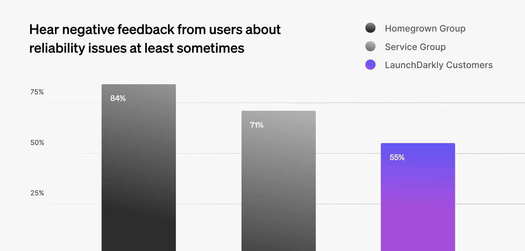 The survey revealed that 84% of those with homegrown feature flagging systems hear negative user feedback at least sometimes, compared to 71% of those with a Service and only 55% of LaunchDarkly customers.