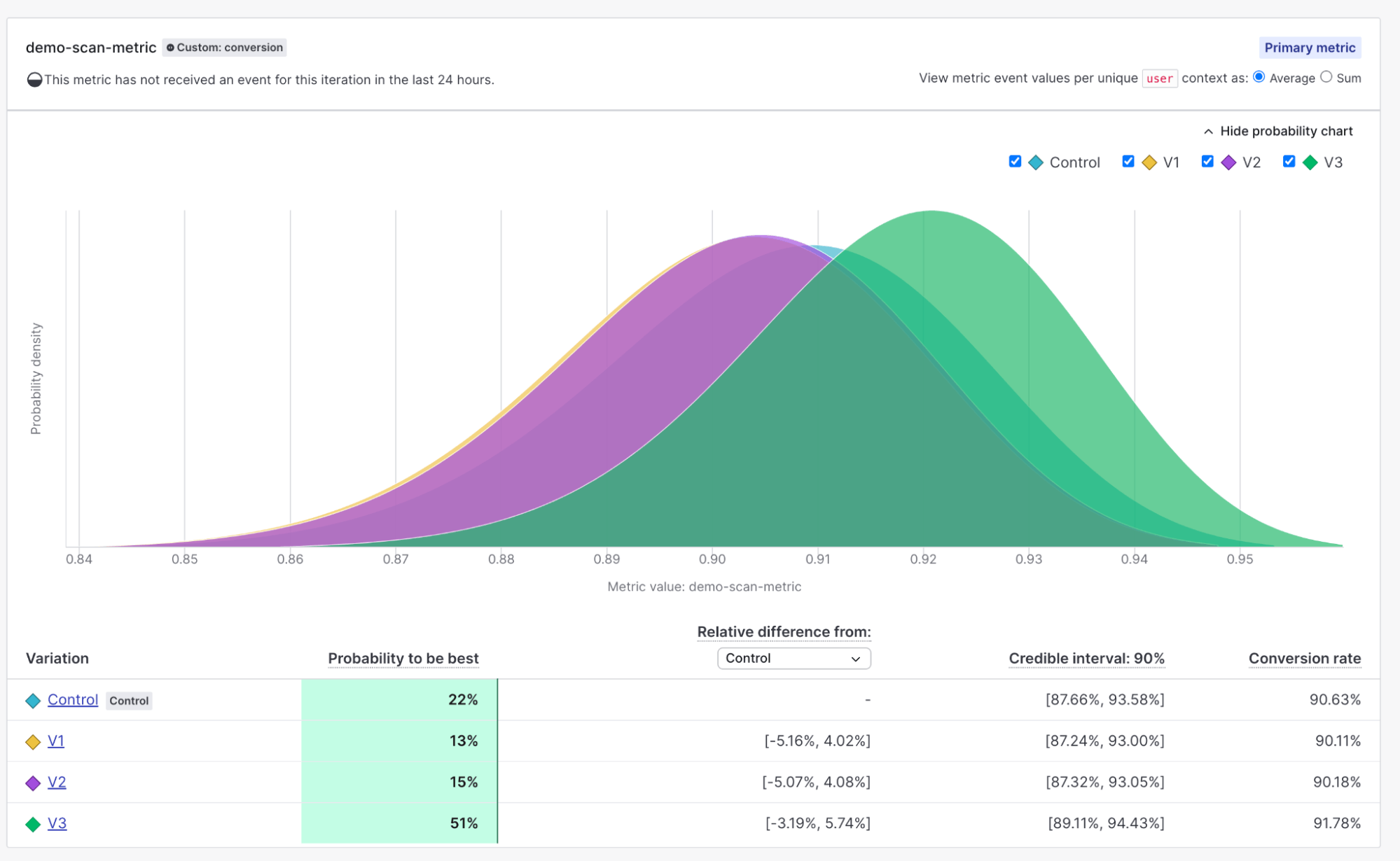 You can see the results within the Results tab at any point during the experiment. However, when an experiment has run its predetermined course, or if enough contexts have encountered your experiment to confidently determine the winning variation, you can easily move from experimentation to implementation.
