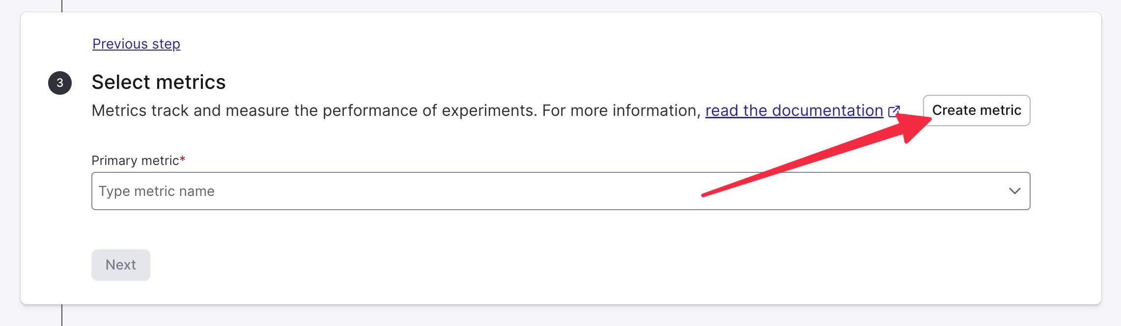 Next, you’ll select what metrics you want added to the experiment. Refer back to the metrics we set up earlier, and you can add them here. If you didn’t create a metric previously, this step has a button to create metrics.