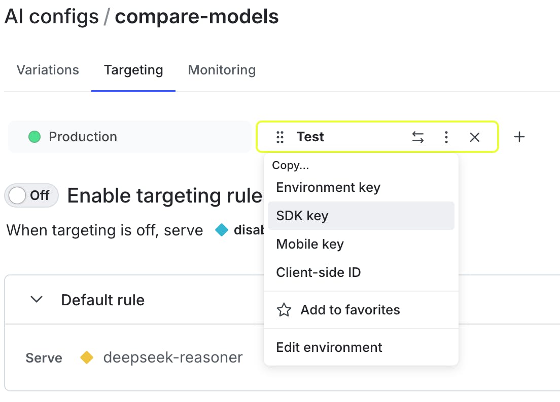 Select the … dropdown next to the Test environment. Select SDK key from the dropdown menu to copy it to the clipboard.
