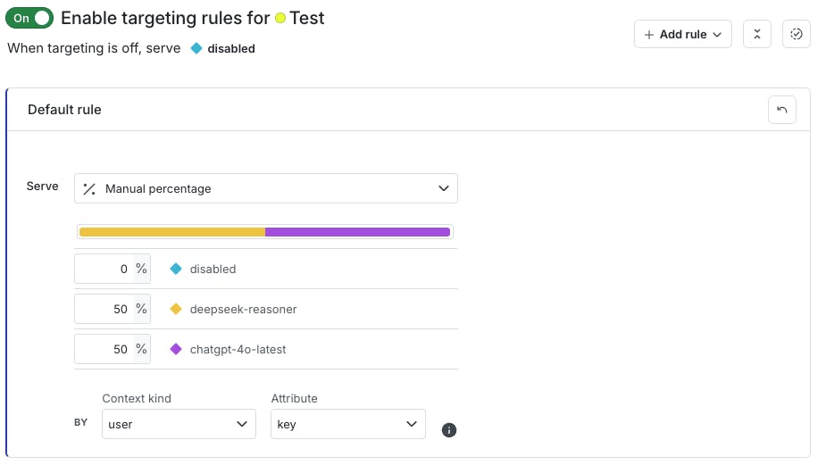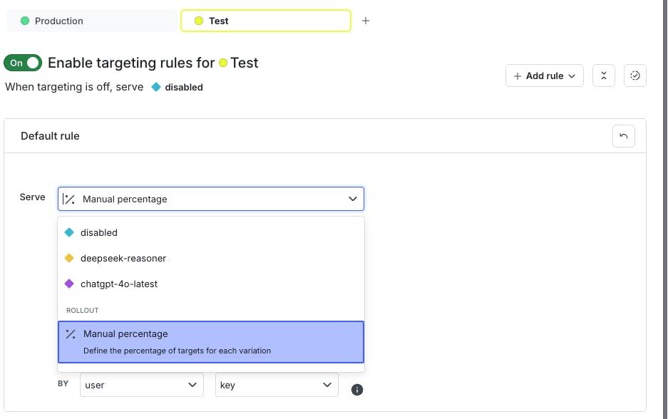 On the Targeting tab, click Edit on the “Default rule” section. Select “Manual percentage” from the dropdown.