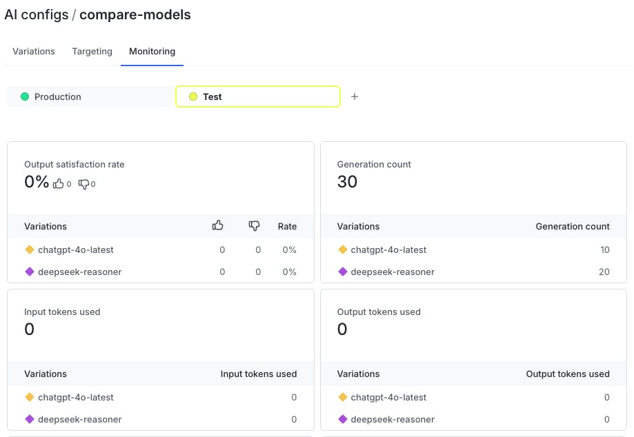 On the Monitoring tab of the AI configs panel, you can see the generation counts for each variation, along with input tokens, output tokens, and satisfaction rate. Notice that the deepseek-reasoner variation served more users than the chatgpt-4o-latest variation. The Generation count should increase anytime you run the application as seen below: