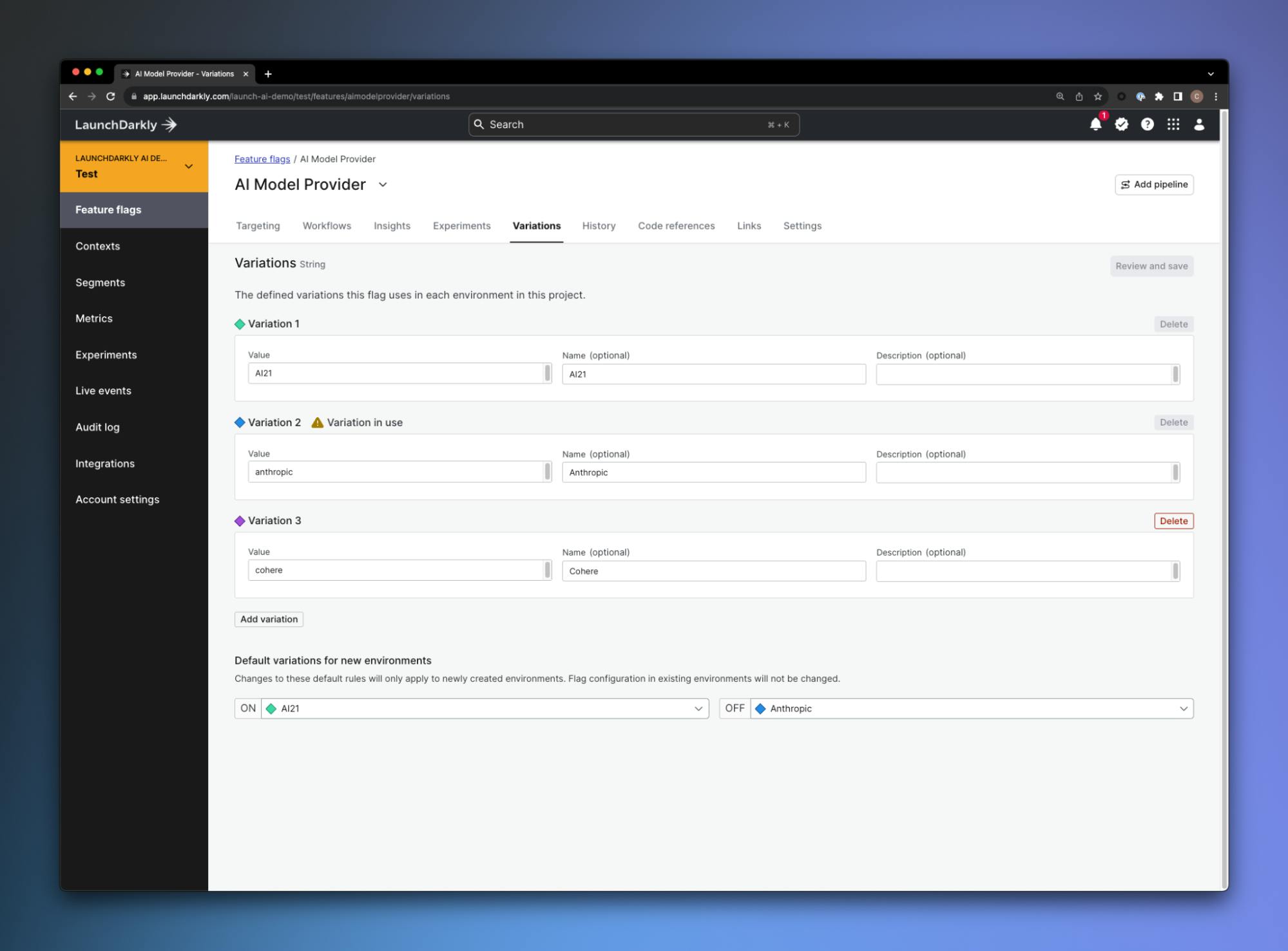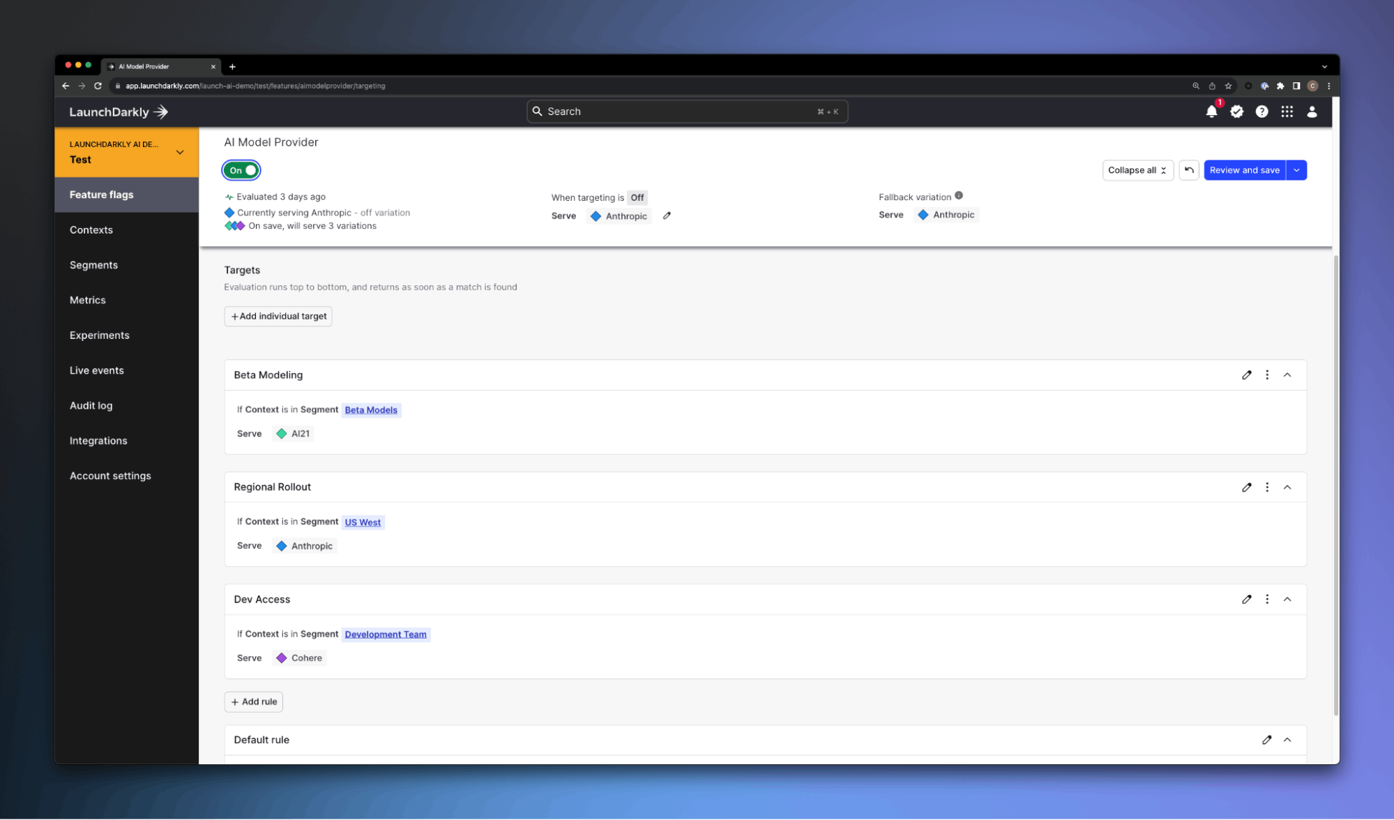 We can define model availability within the LaunchDarkly platform, and switch between these configurations within our actual deployed application using these feature variations. We can use a combination of release targeting and default rules to enable specific models based on any parameters.