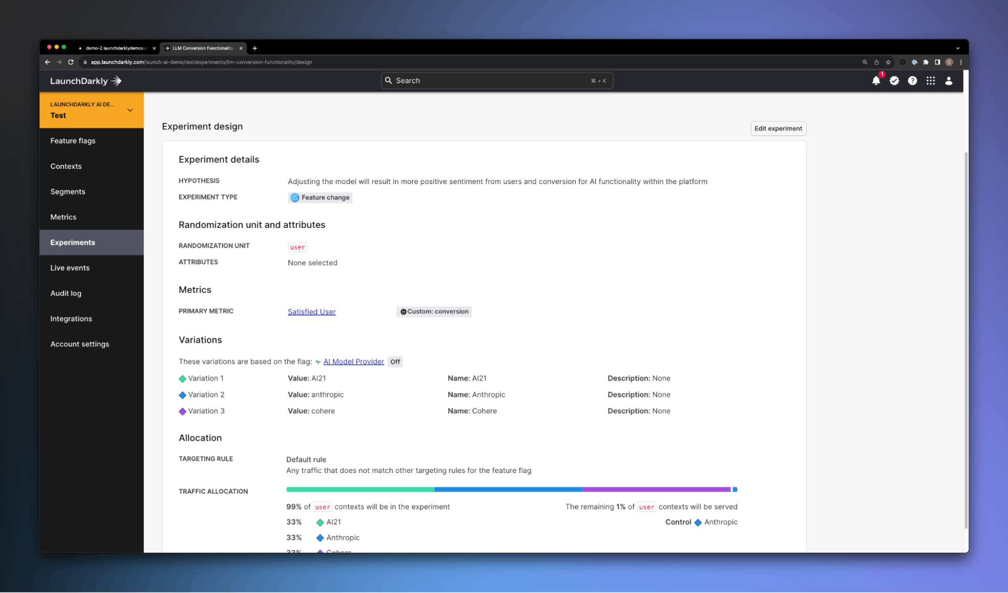 Leveraging LaunchDarkly as the core feature management platform for your AI applications is going to set your engineering teams up to be able to iterate quickly on innovation in this space, control who is going to receive every change—managing the risk of your rollouts completely. It’s going to let you target experiences at every user, and measure every change you make in the platform.