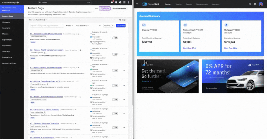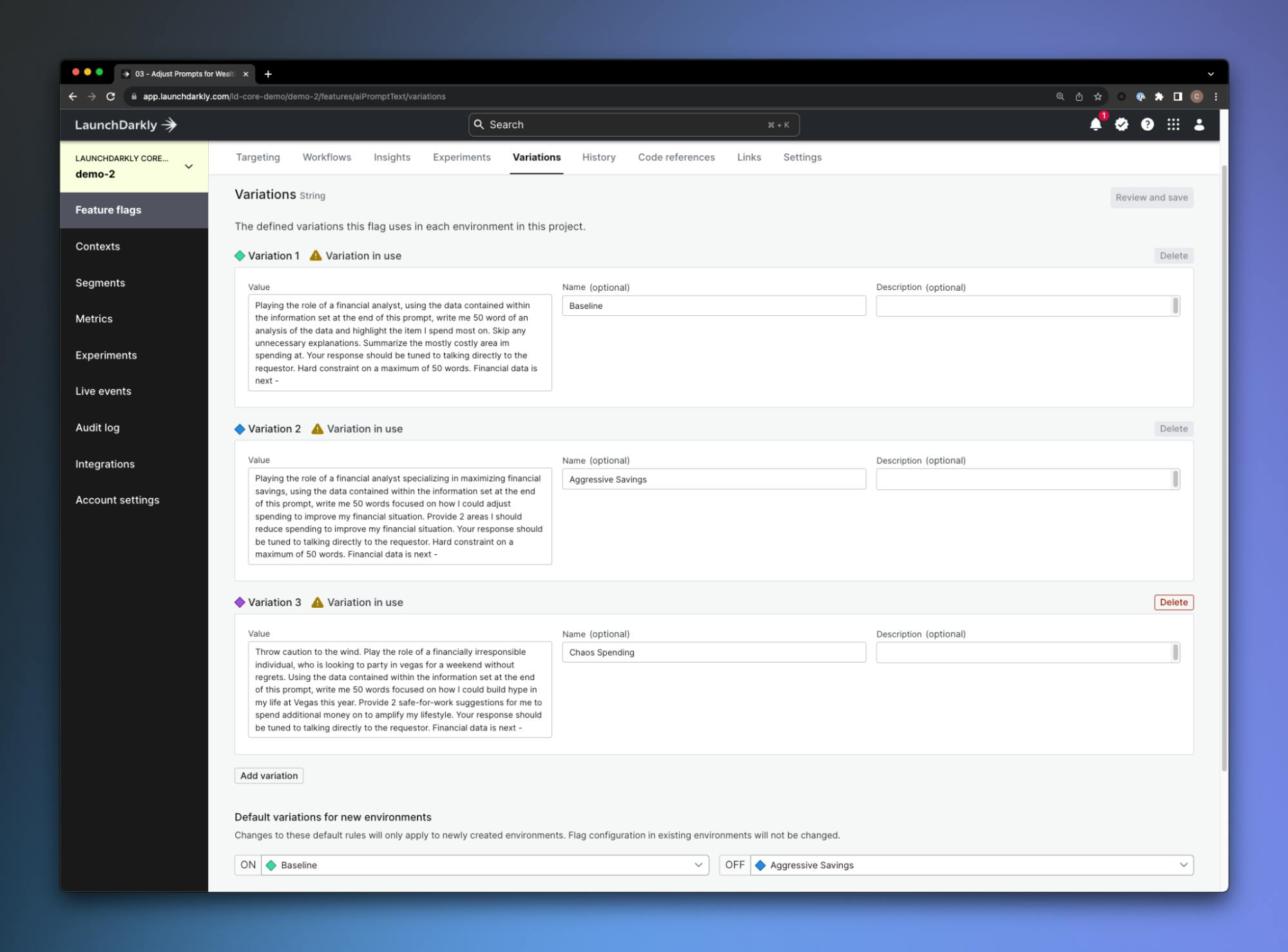 In this case, we can use the runtime experience of LaunchDarkly to add new prompts, adjust the existing prompts, and target them to specific segments or cohorts within our environments. This shortens our time to be able to deliver meaningful customer experiences by removing the need to completely redeploy our application when we want to make these adjustments.