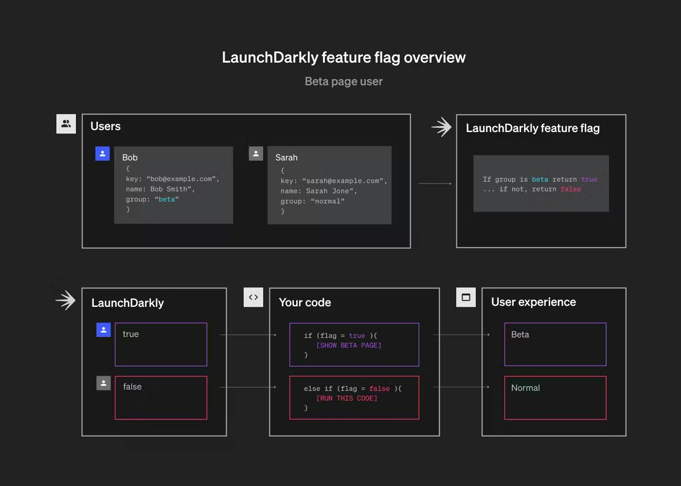 Image caption: We add Bob and Sarah to a beta audience segment in LaunchDarkly. Then we use a feature flag and targeting rules to release a beta feature to the beta group only.