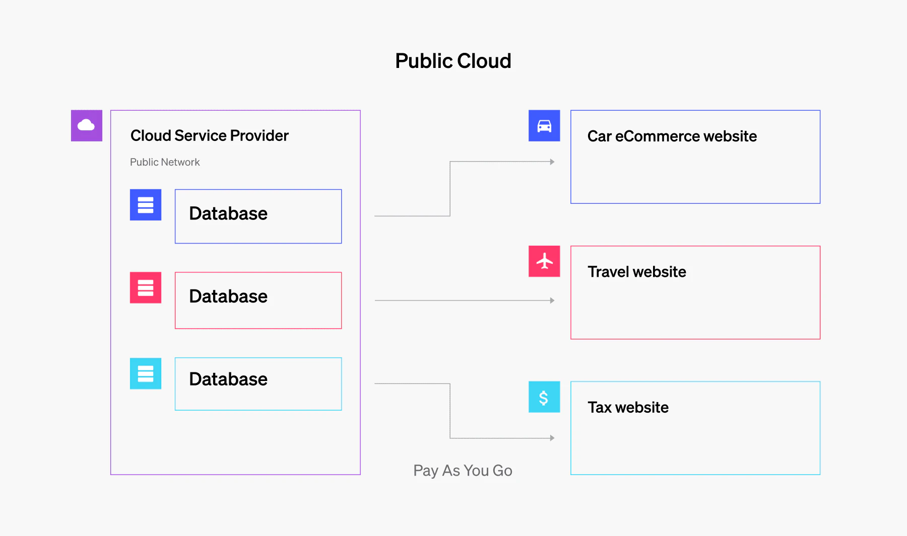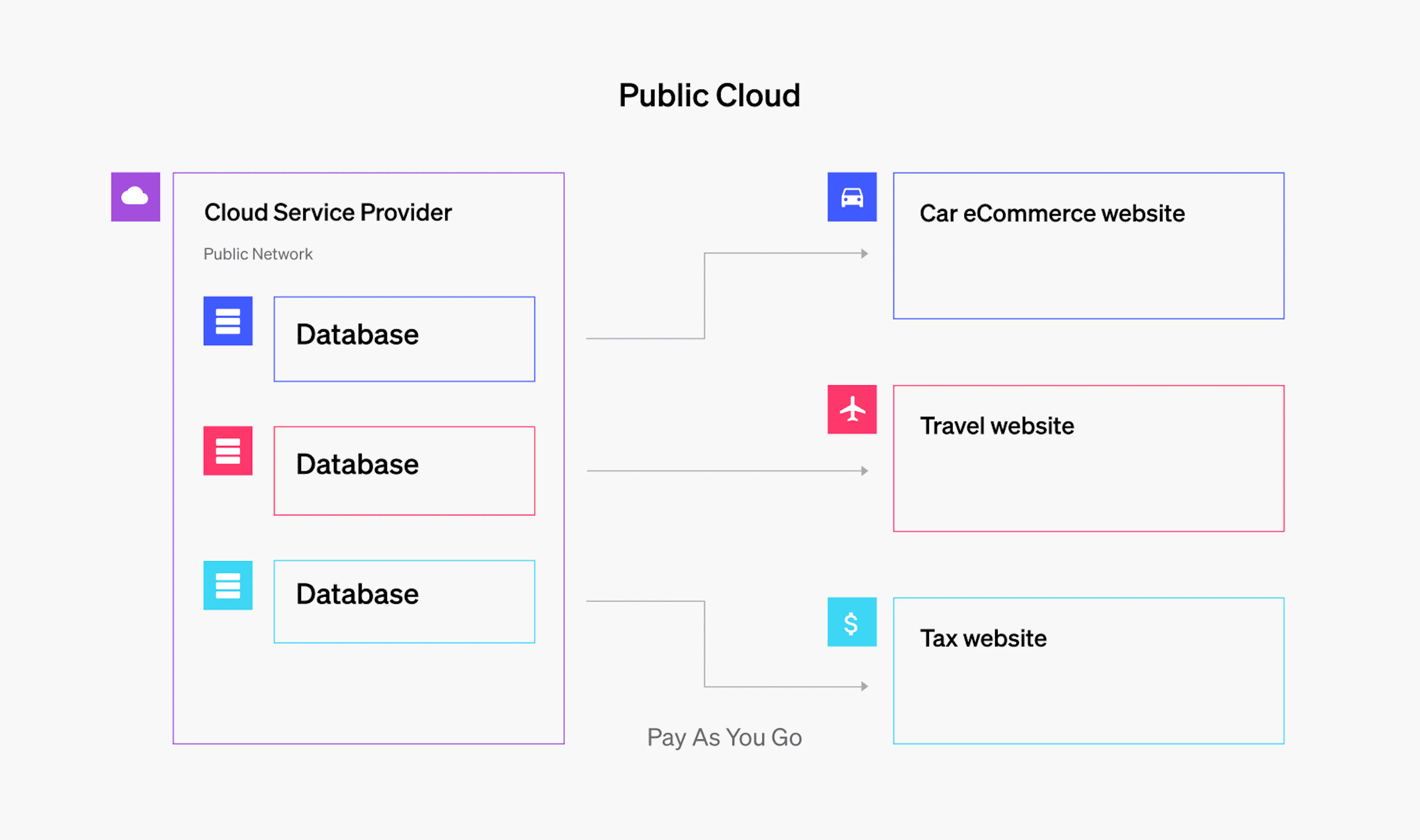 A public cloud deployment is best identified by the characteristic that you don’t own any hardware or infrastructure, all your resources are provided to you by a cloud service provider. “Public” in this model means that such a cloud is available for the general public, and resources are shared between all users, also known as “multitenancy.”