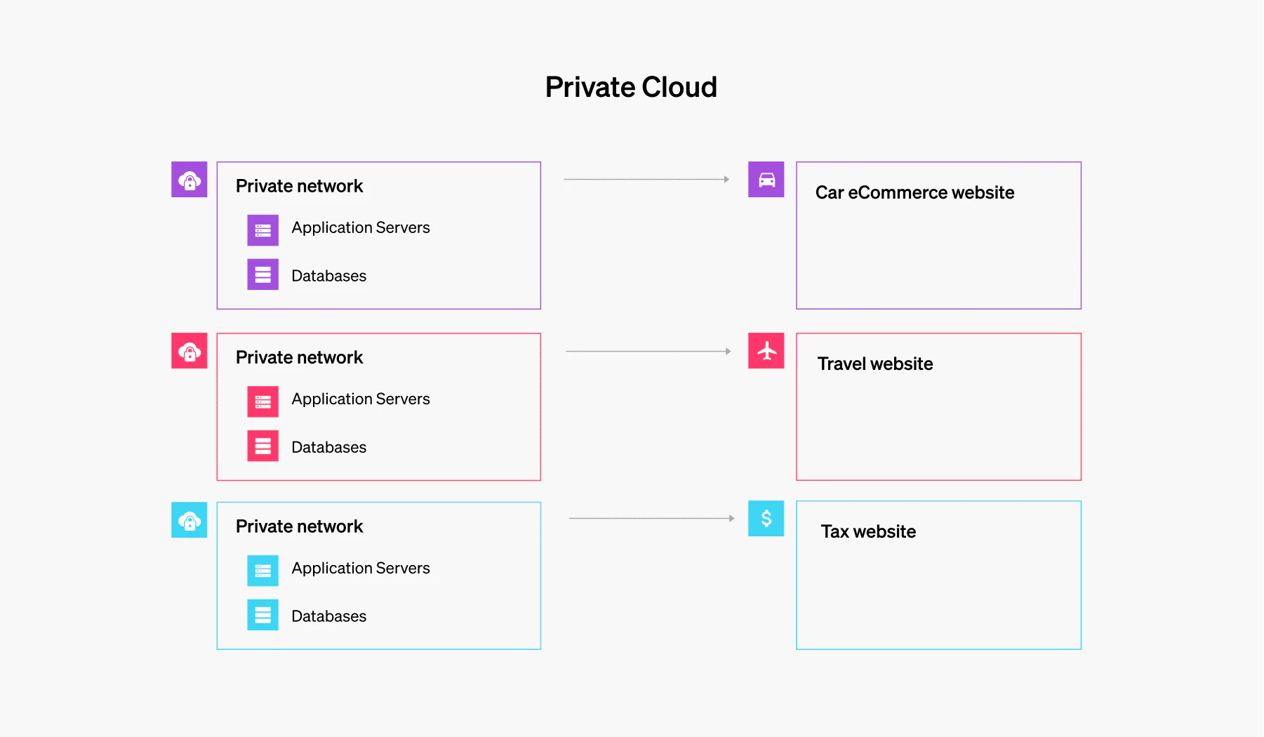 Surprisingly, you can also get a private cloud from a public cloud provider. A cloud provider will isolate resources from its cloud and make them available only to you, you won’t share tenancy with other companies in that private cloud, but you no longer have to host the physical hardware and infrastructure or maintain it. Regardless of how your private cloud is hosted the key takeaway is that resources are dedicated to a single organization.