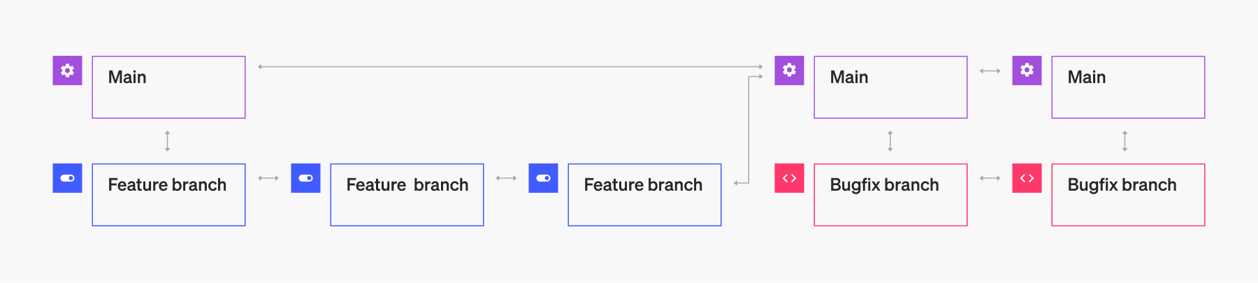 Two typical use cases for branching are feature branching and bug branching. Starting from the main branch, a developer writes a piece of code to introduce a new feature, or they develop a snippet of code to fix a bug. After this developer tests their code, they trigger a merge operation. This integrates the new element into the main branch (or fixes the bug).