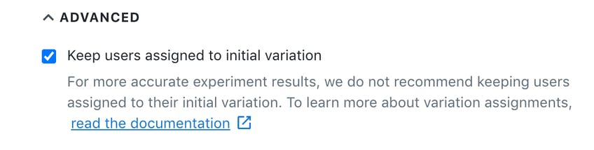 As part of the experiment allocation rule, LaunchDarkly now offers an advanced option to keep your experiment users assigned to the same variation throughout the lifetime of an experiment—which ensures a consistent user experience for the duration of the event.
