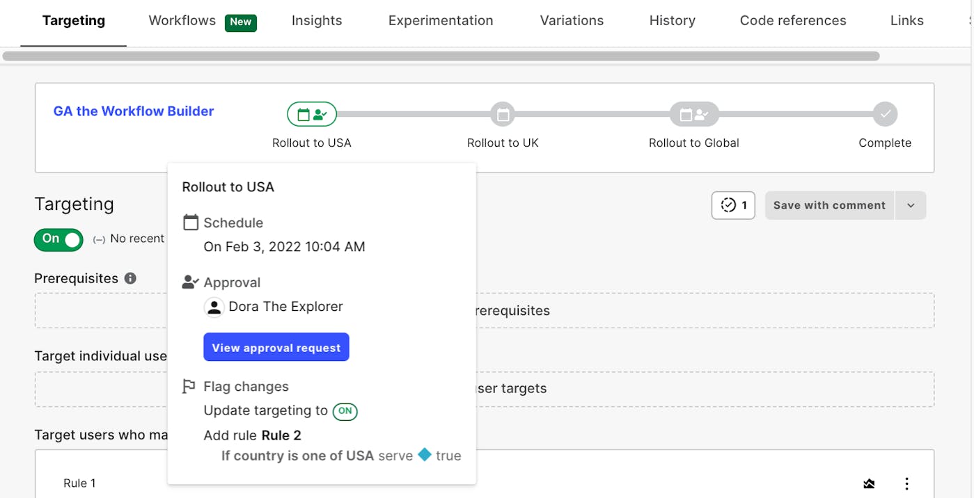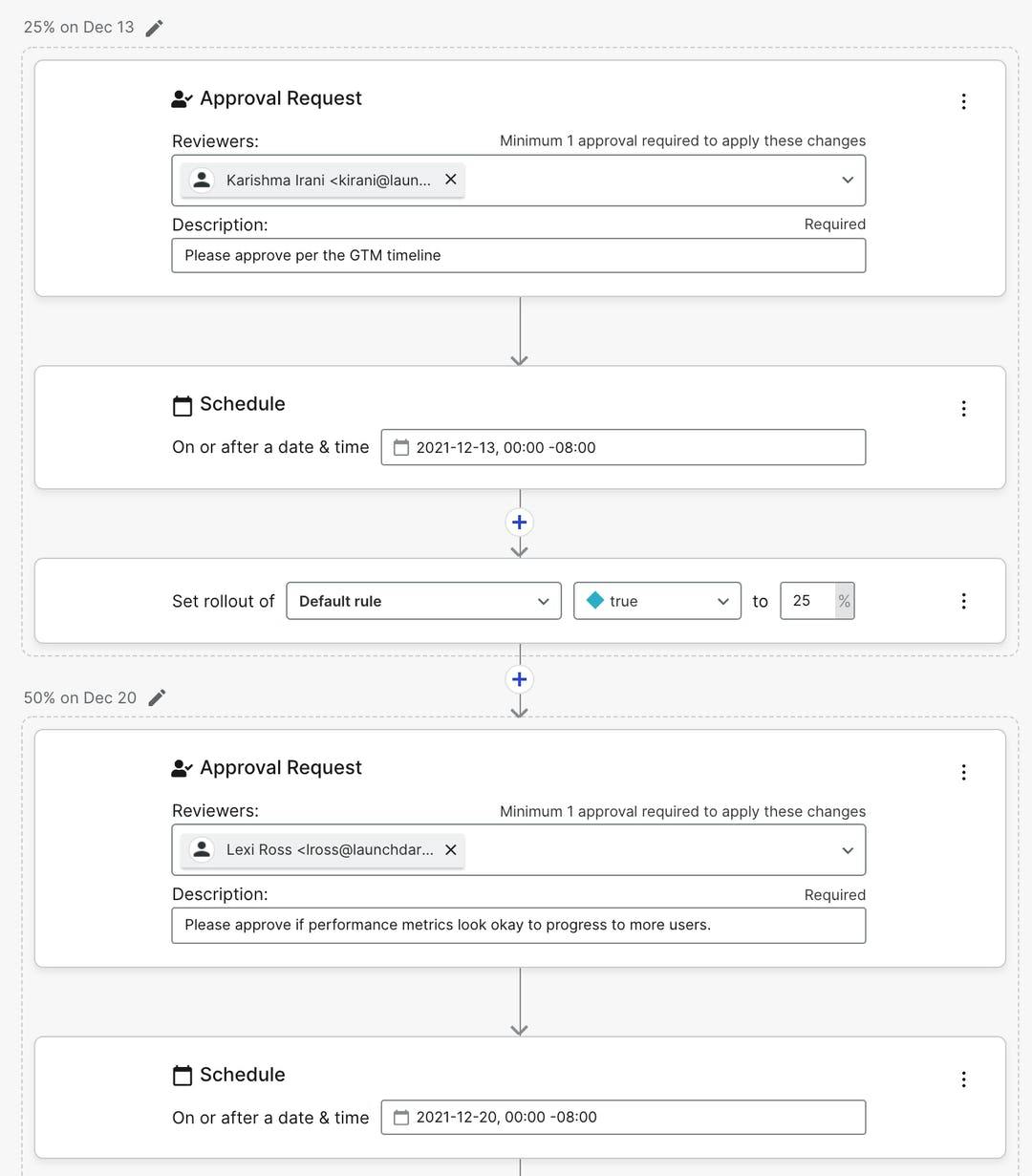The new read-only view for workflows lets team members, who stumble upon a flag with an ongoing workflow, see more details about what was created and what the next changes will be. You and your colleagues can review all the previous and future steps of a workflow, and easily understand what stage of the release workflow the flag is currently in.