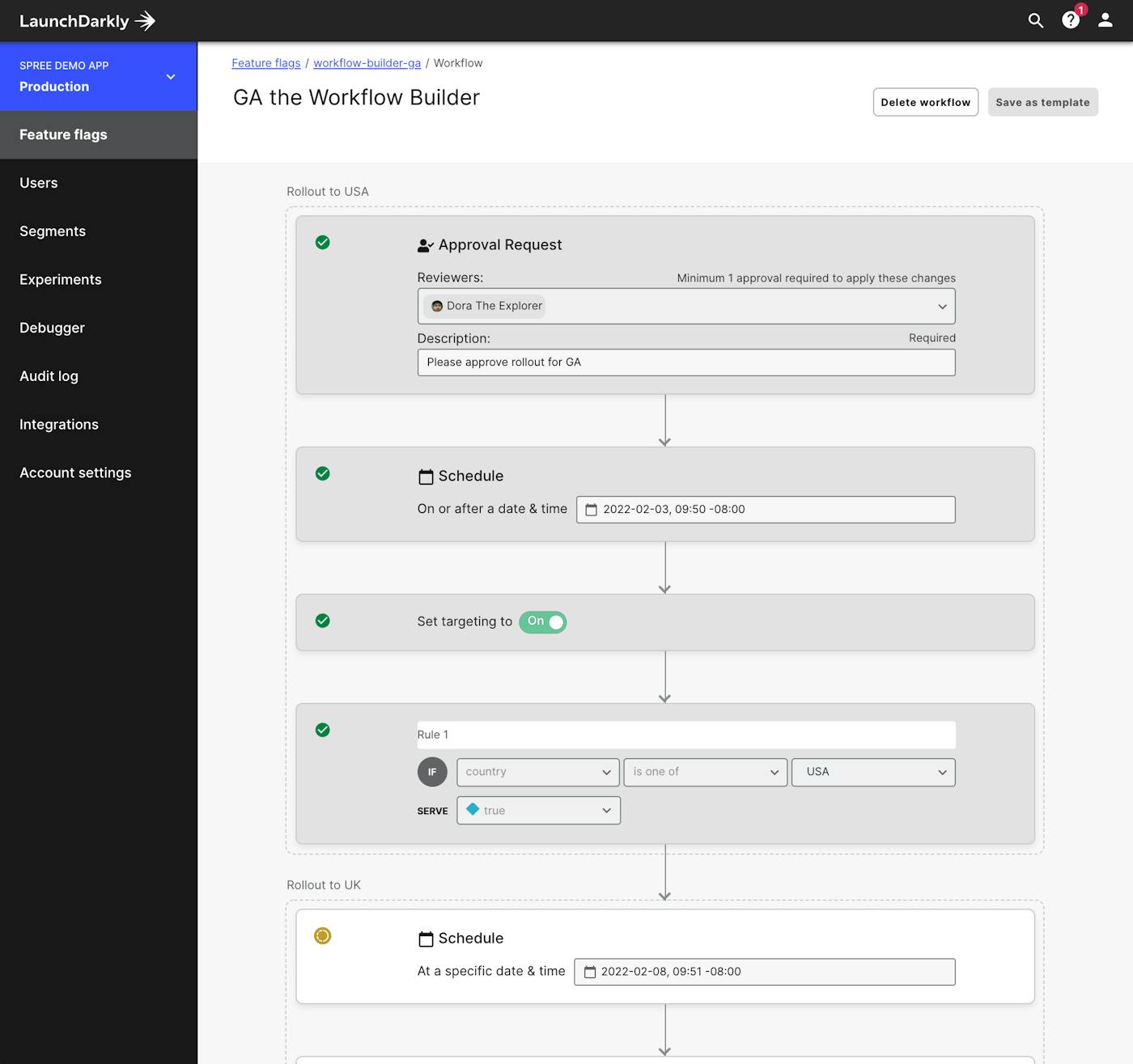 In December, we released a beta version of the Workflow Builder that allows your teams to configure a multi-step, multi-approval rollout for feature flags (read the announcement here). By automating the manual steps you take to roll out a feature flag, there’s less room for "accidental" flag changes. With LaunchDarkly executing the steps of your release, you can spend more time planning, developing, and innovating for your users.