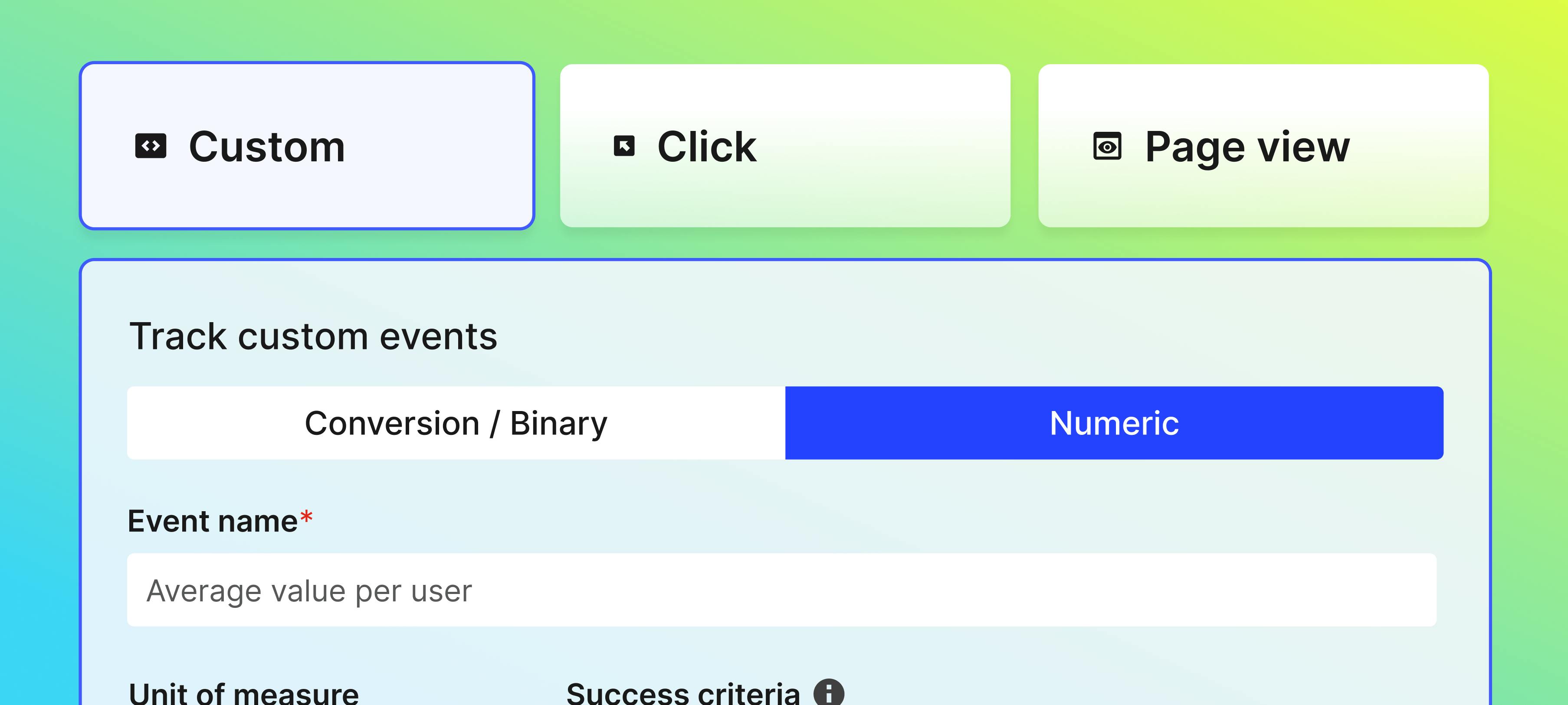 Precisely configure each metric with a guided setup that allows you to define exactly how LaunchDarkly will accept and aggregate your measurements to answer the exact questions your team needs answers to.