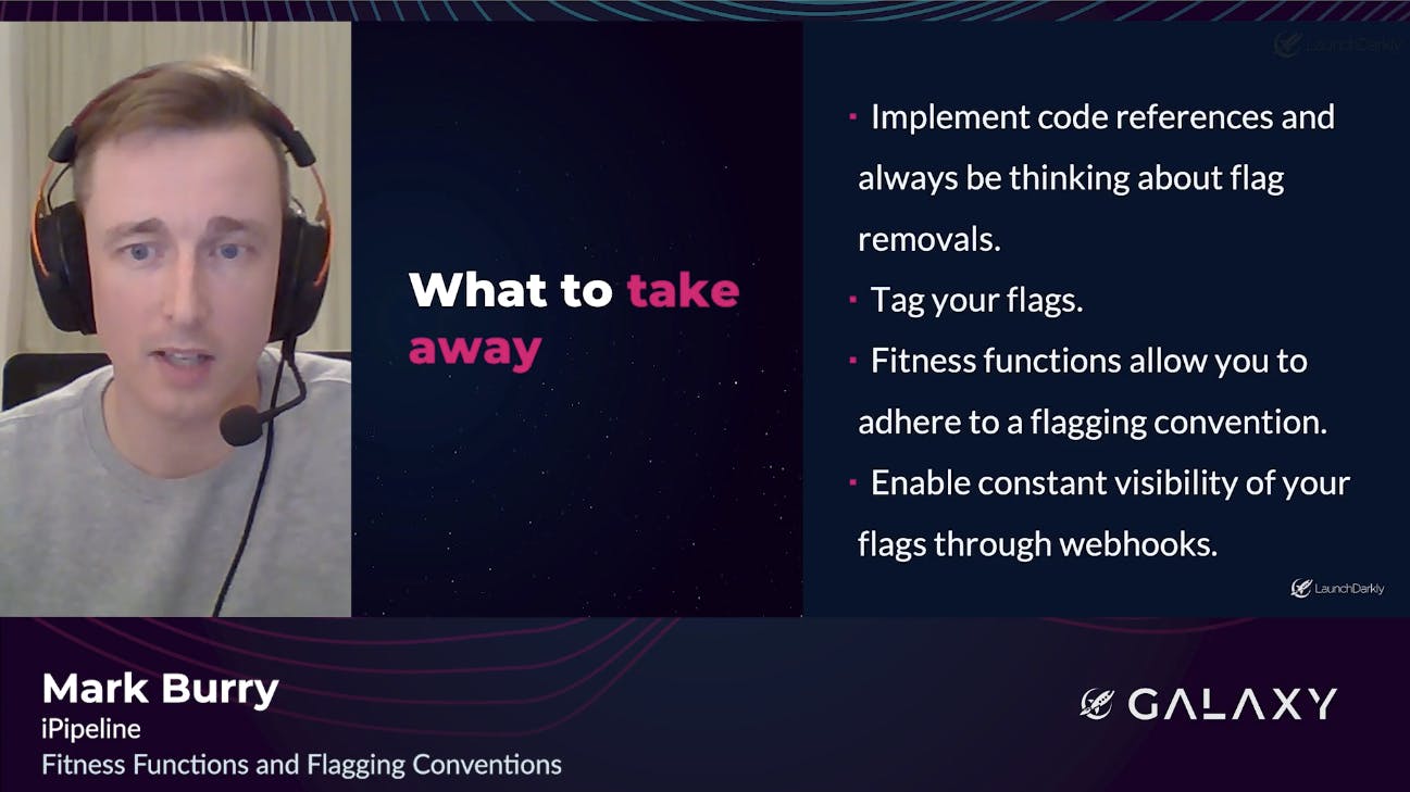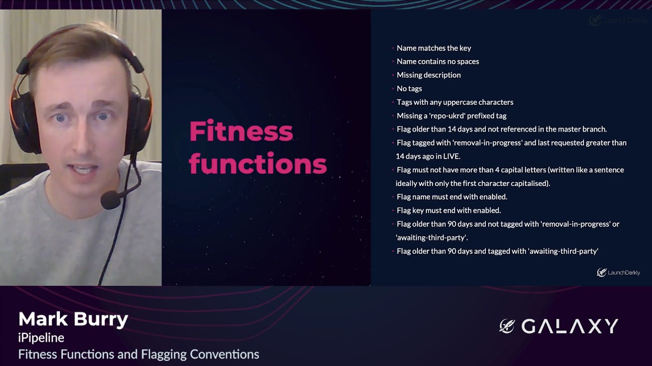 Um, and then the fitness functions themselves, they allow you to adhere to a flagging convention, so create a naming convention, life cycle, time frame, et cetera, and then wrap an automated fitness function around it. Um, this way you can ensure that you adhere to those, uh, naming conventions, uh, throughout all of the life cycles of the flags.