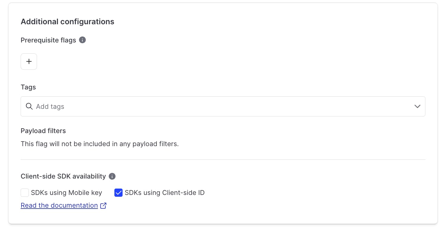 Set the flag type to Release Flag and Boolean, and check the client-side SDK checkmark. When complete, your feature flag setup should look like the below.
