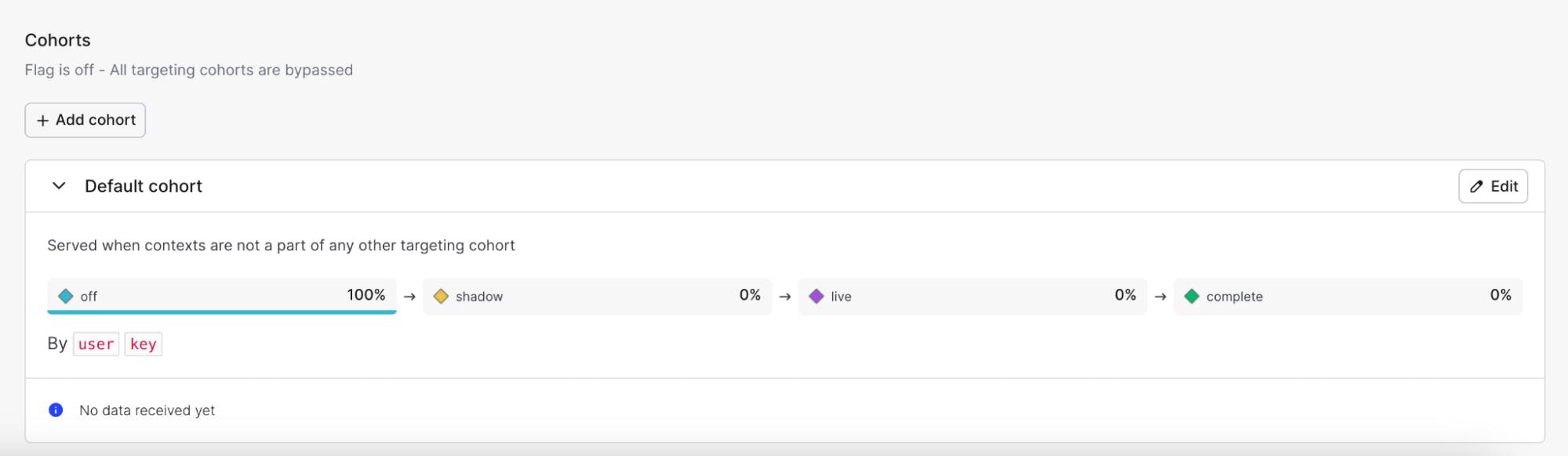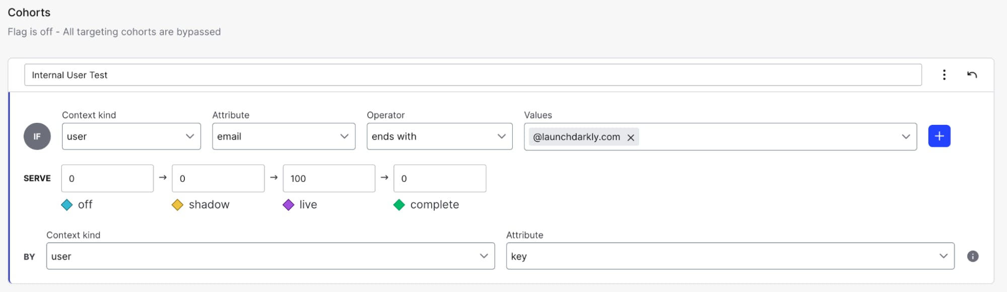 Using cohorts, we can create different end-user groups to test both the functionality and performance of our new systems. For example, say you’re changing your database querying logic, and want to test it with internal users before rolling the changes out to customers. You could create a cohort rule that states that all users with a specific email domain are at the “live” stage of our four-stage migration.
