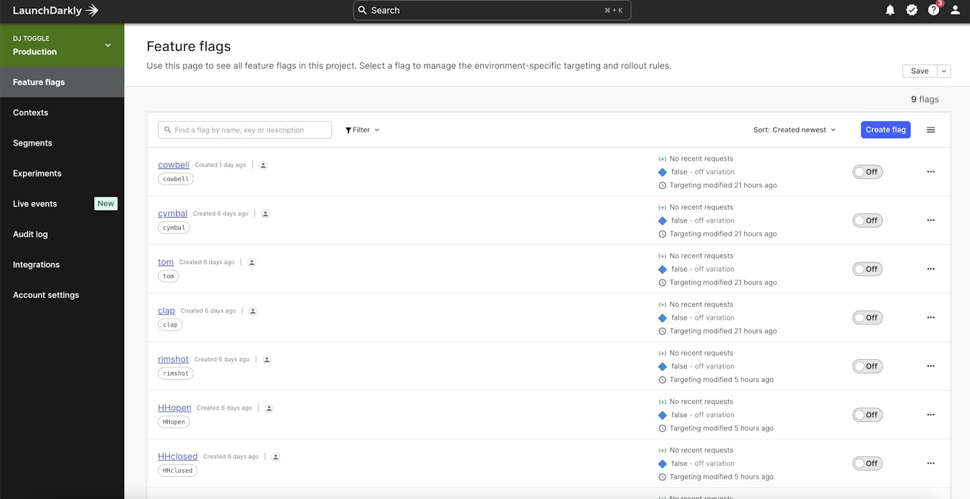 Once the flags were created, I initialized the client-side JavaScript SDK and called a custom function that would initialize each flag when the SDK initialization was complete. I passed the key for the flag as well as a variable that represented the audio track associated with that flag.