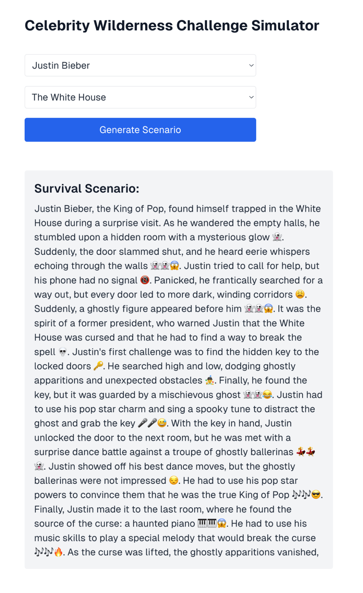 Test that you’ve got the Replicate token input correctly by selecting a celebrity and a location and seeing if it returns a silly wilderness survival scenario.