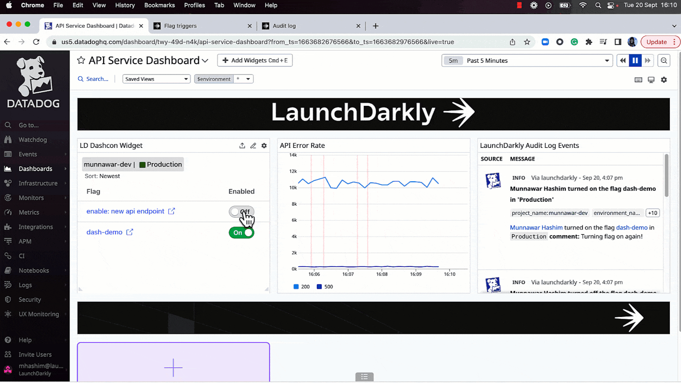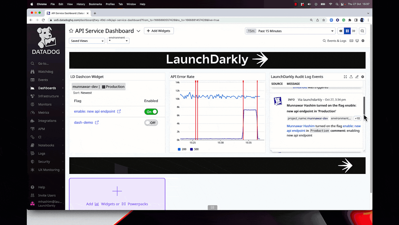 3. My team wants to enable a new API endpoint in order to further reduce the number of 500 type errors that customers have been getting. I can toggle flags on and off using the Dashcon widget whilst staying on the Datadog dashboard.