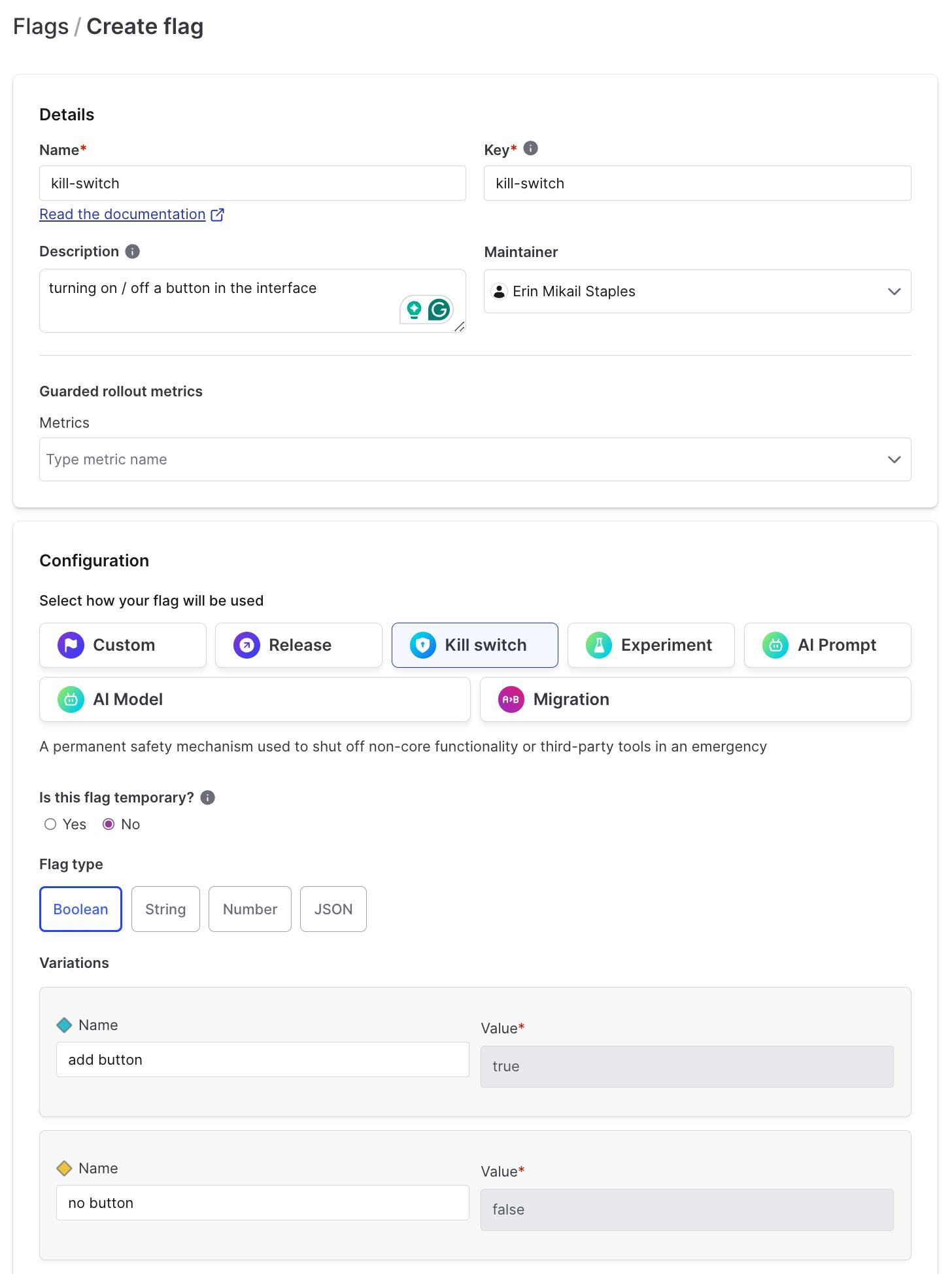 In your new project, create a feature flag named kill-switch. This flag will control a button feature within your application. Set the flag type to Kill Switch and Boolean, and check the client-side SDK checkmark. When complete, your feature flag should look like the below. When complete, click save.