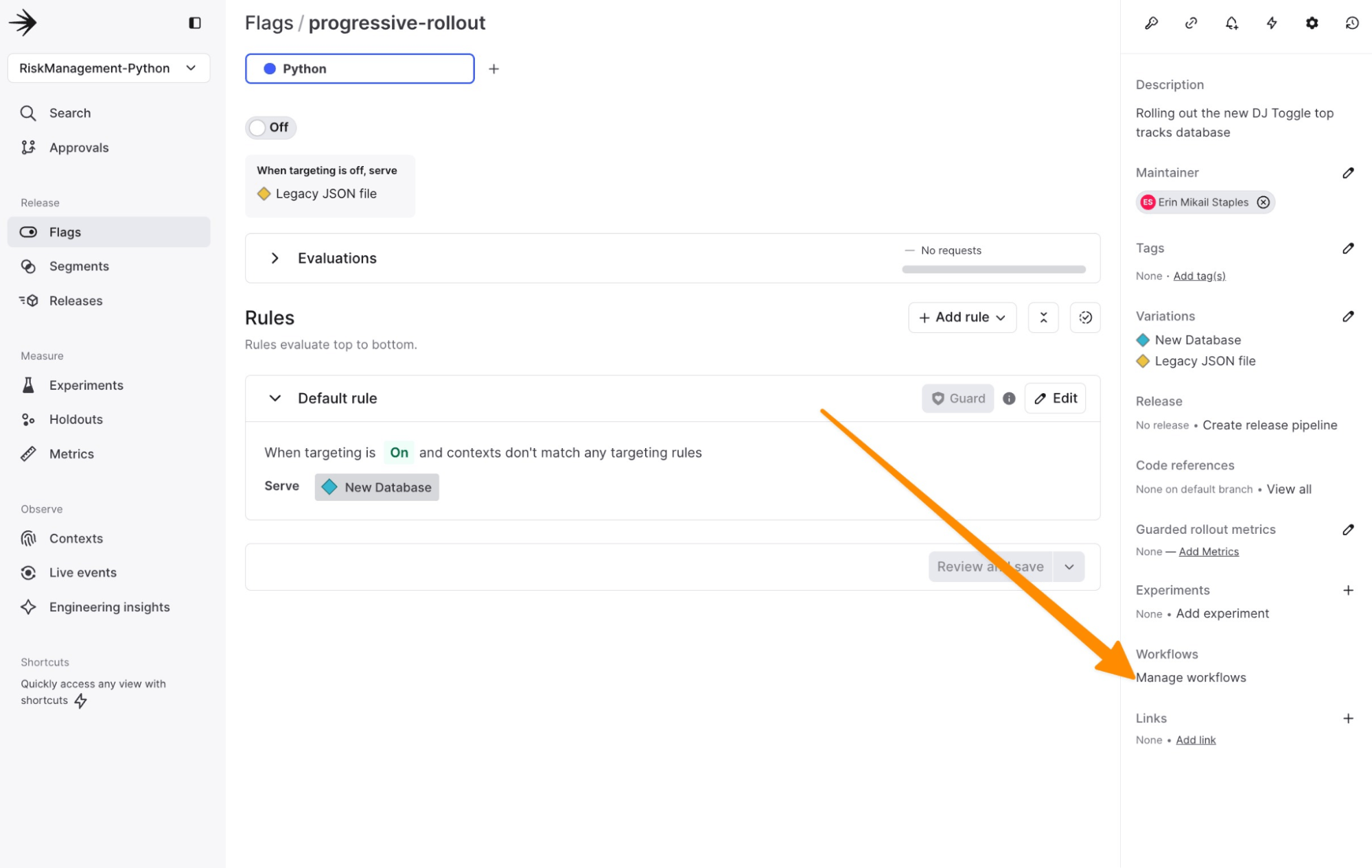 After you’ve created your flag, navigate to the right-hand panel of the flag details screen and click on `Manage workflows.’ This will open a new page where you can create your progressive rollout workflow.