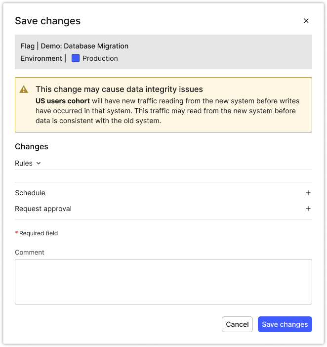 Migration Assistant includes guardrails that will warn you when an action could jeopardize your migration. This gives teams confidence that at each stage they are making safe changes to their migration flag and not accidentally moving a cohort to a stage before they're ready.