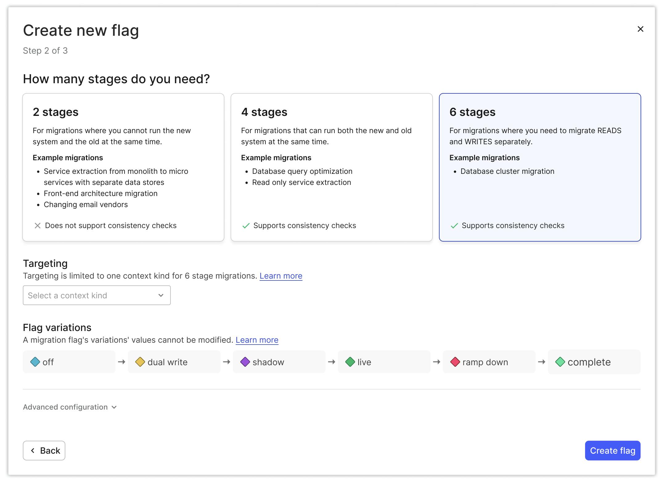 When you create a new feature flag, you can select the new migration flag type. Doing so will prompt you to select the type of migration you’re planning to execute (2-,4-, or 6-stage). Depending on the type of migration you select, the stages of your migration will populate and become associated with the newly created flag.