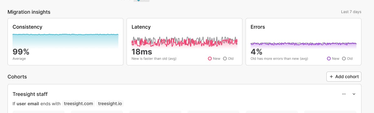 You can now see error, latency and consistency metrics broken down by cohorts, as well as aggregated for the entire migration, so you can quickly understand the overall health of your migration. And if anything goes wrong, you can react and instantly move one or more cohorts safely back to a previous stage in the migration, all without waiting for lengthy CI/CD pipelines to deploy code changes.