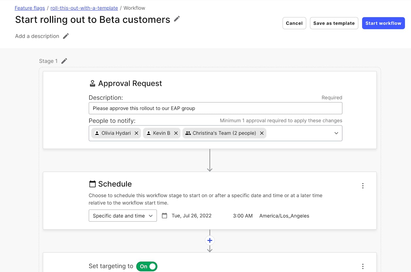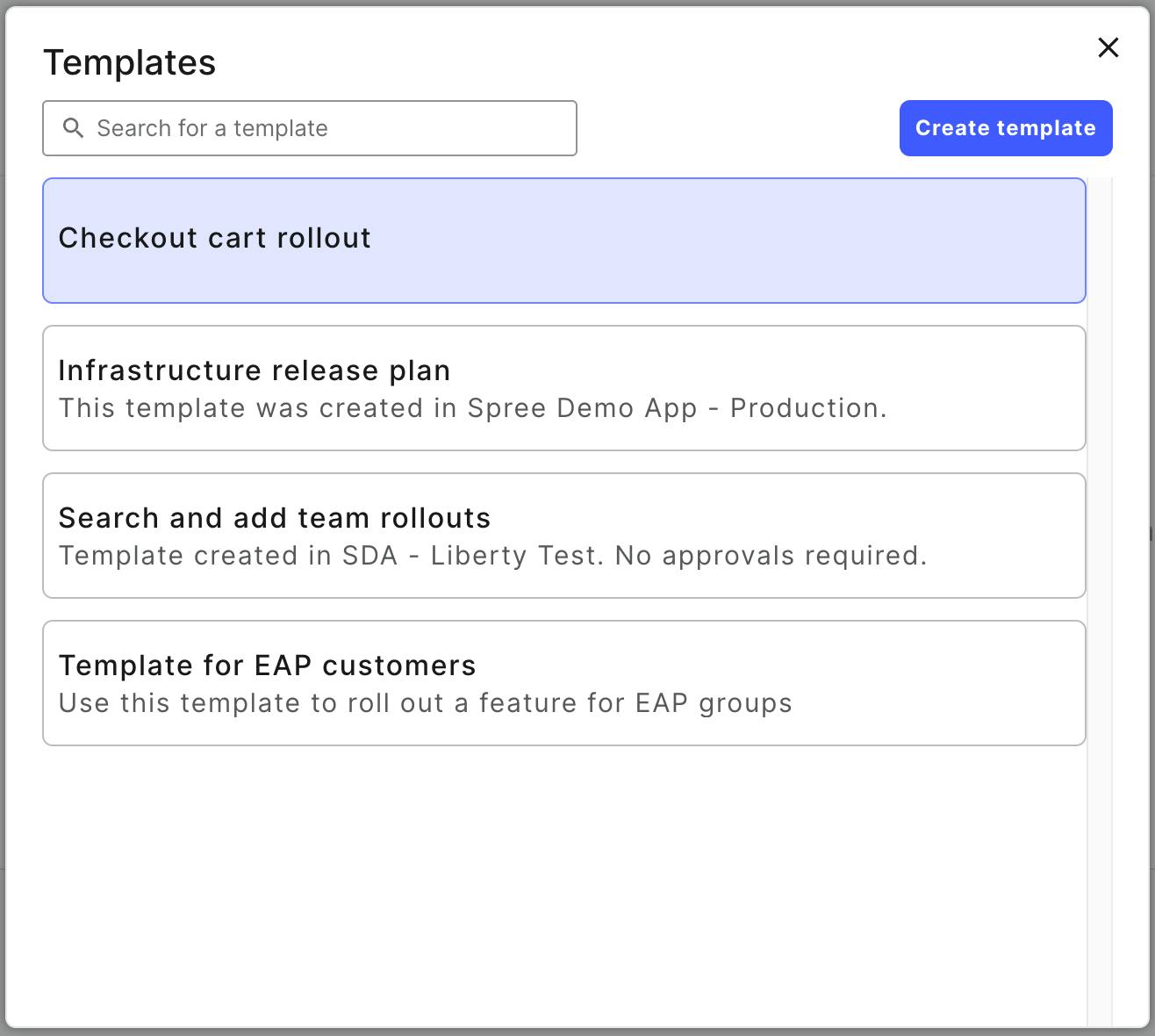 The next time you want to roll out a feature flag, your previously saved workflow templates will appear as an option to quickly apply and move on. Templates will help your organization scale best practices, ship with velocity, and build a foundation for operational maturity.