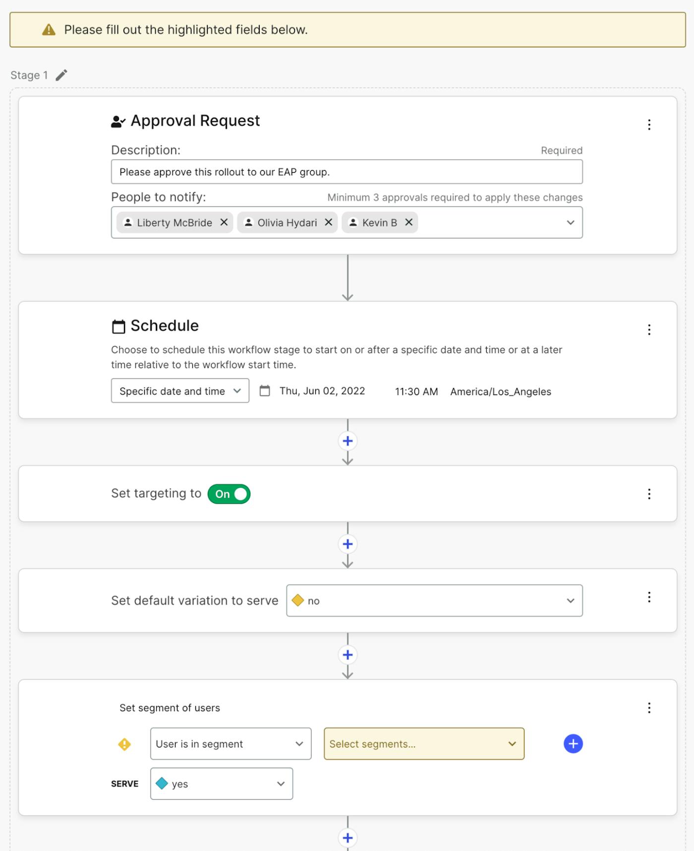 Once you choose a template, you’ll be guided to fill out pertinent information required for your feature flag and environment. Workflow Templates lay the groundwork for your teammates to easily manage canary releases, progressive rollouts, or scheduling for major launches. Whether your organization’s launch strategy is green or seasoned, this is a perfect way to integrate the process into practice.