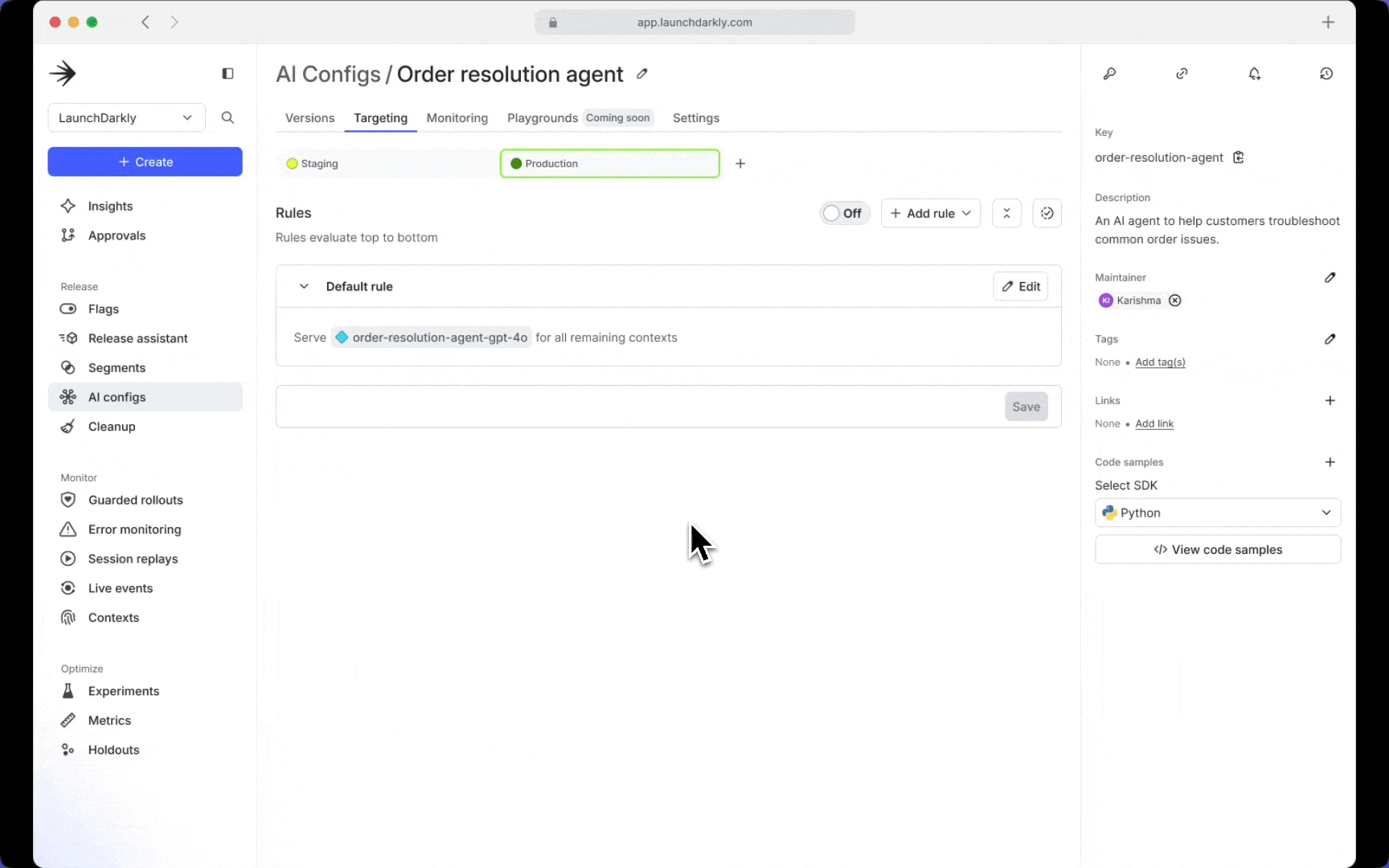 At LaunchDarkly, we've always been committed to helping developers de-risk their software releases, which is why we're thrilled to introduce AI Configs – to extend the value of feature management to engineering teams building GenAI software and help them with the challenges that come with it.