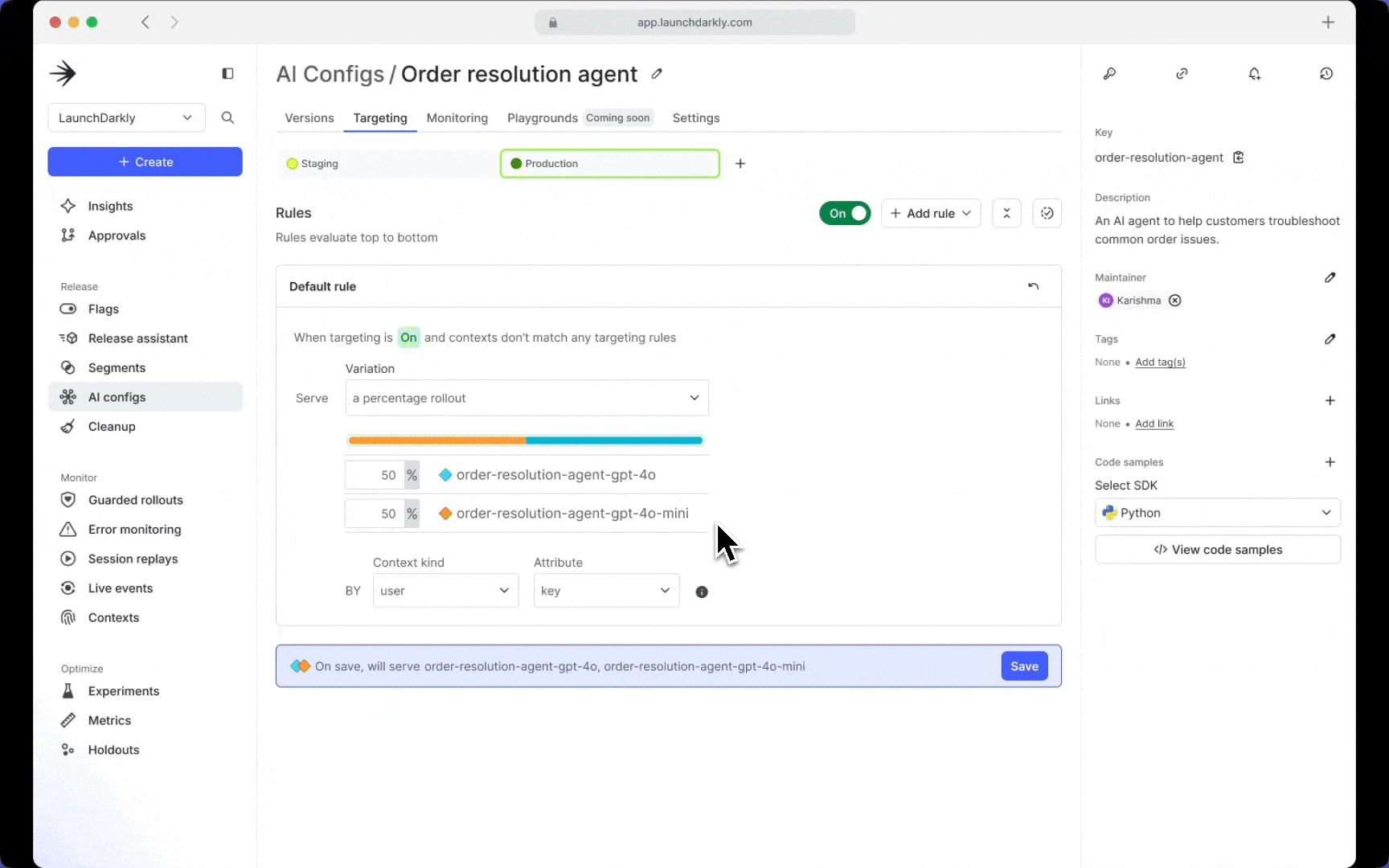 When rolling out a new model version or prompt iteration, the best practice is to do so by exposing it to a small set of users first to make sure that it works as expected. The ability to target different versions of your AI Configs to specific user segments allows for tailored experiences and controlled rollouts. By gating access to larger, more resource-intensive models, teams can also manage expenses effectively while delivering advanced capabilities to targeted audiences.