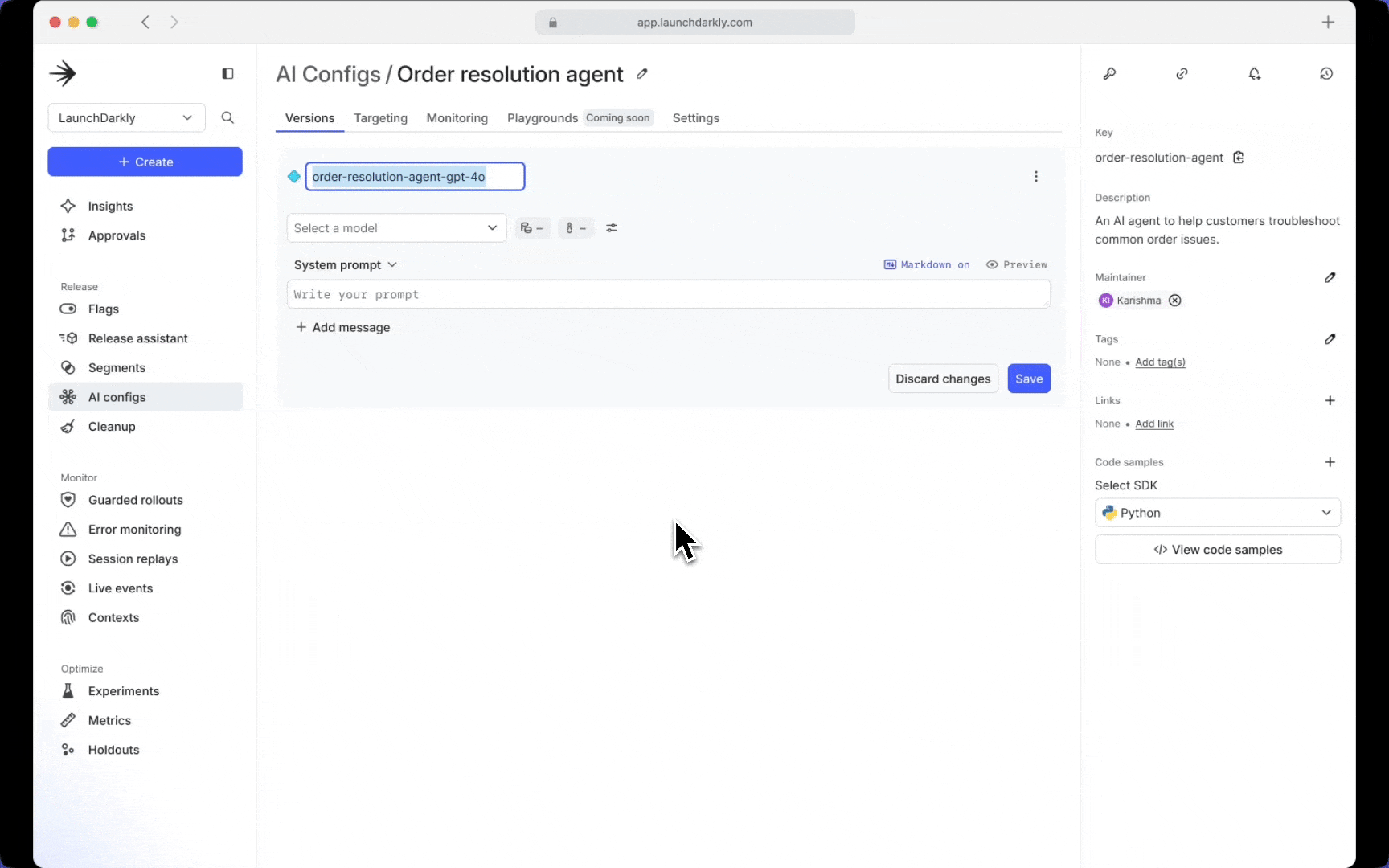 LaunchDarkly can help your team manage, test, release, and monitor your next GenAI feature, without the need for complex and non-scalable config files or additional tooling. With access to LaunchDarkly’s AI Configs, your team can: