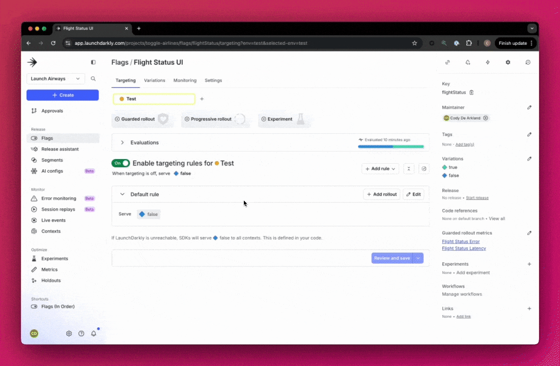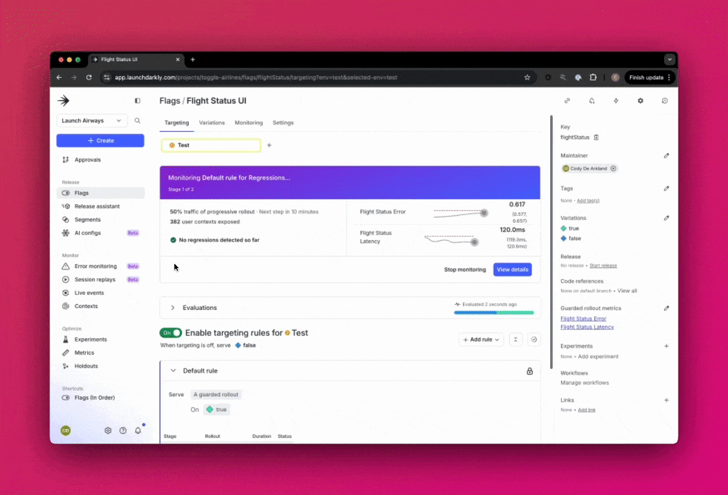 “Guarded Releases represent a whole new approach to shipping software fast and safe at LaunchDarkly, where you don't have to compromise speed at the expense of stability. Guarded Releases bring together real-time monitoring, automated recovery, error tracking, and user insights to resolve issues faster, elevate the user experience, and accelerate innovation. With Guarded Releases, teams can ship, knowing each deployment is smarter, safer, and fully optimized for success.” - Cody De Arkland, Sr. Director, Product Incubation at LaunchDarkly