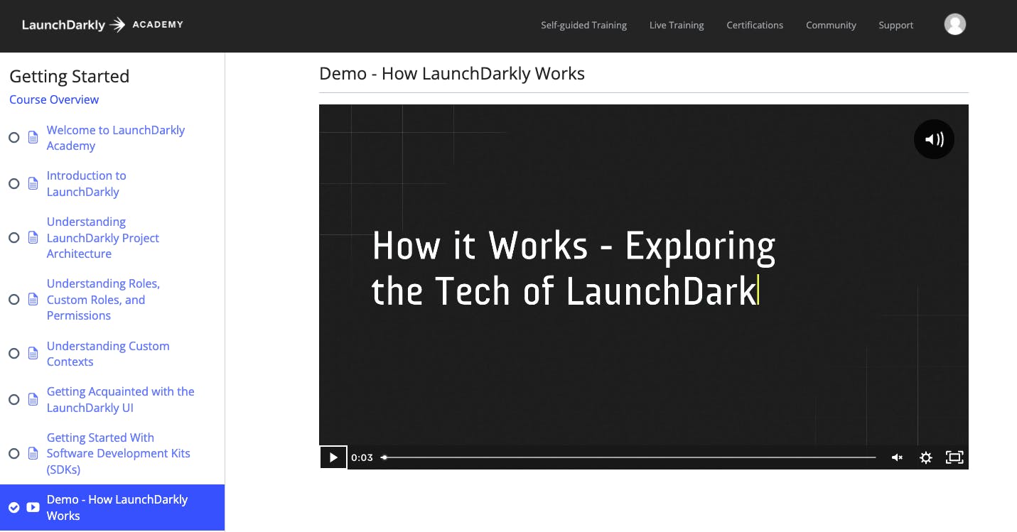 - Short video modules: Concise, targeted videos that cover key topics, including the LaunchDarkly architecture, SDK setup, and best practices.