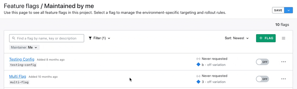 - Find the flags you maintain on a specific feature launch – filter for a launch tag + maintained by ”me”.
