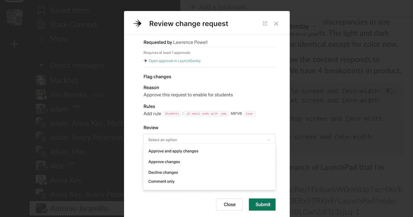Previously, teams collaborated on reviews and approvals via email. Now, with the LaunchDarkly app for Slack, you can manage those approvals easily from your favorite collaboration tool without skipping a beat.