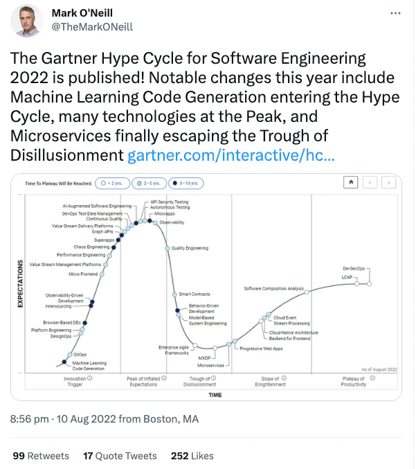 In keeping with DevOps’ journey, microservices has passed Gartner’s Peak of Inflated Expectations and as of 2022 are making the climb towards the Scope of Enlightenment.