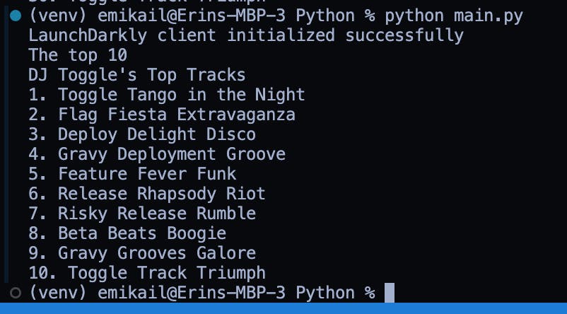 - Finally, the application will print out a list of tracks, either from the database or the JSON file depending on the evaluation of the feature flag. The application is then set to run if the script is directly executed and the LaunchDarkly client is closed to free up any remaining resources.