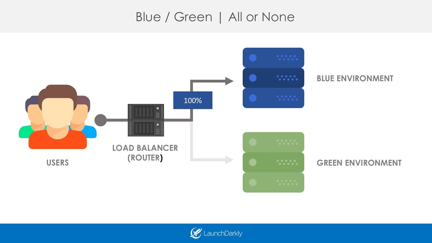Using feature flags, you could still manage your traffic with a load balancer with the added benefit of gradually rolling out new features to your users. For example, you could switch from green to blue with the feature flag turned “off” in blue. Then, once traffic was flowing to blue, you can turn on the feature flag and gradually release the feature to 1%, 5%, 20%… of your users until you were satisfied with the performance and feedback.