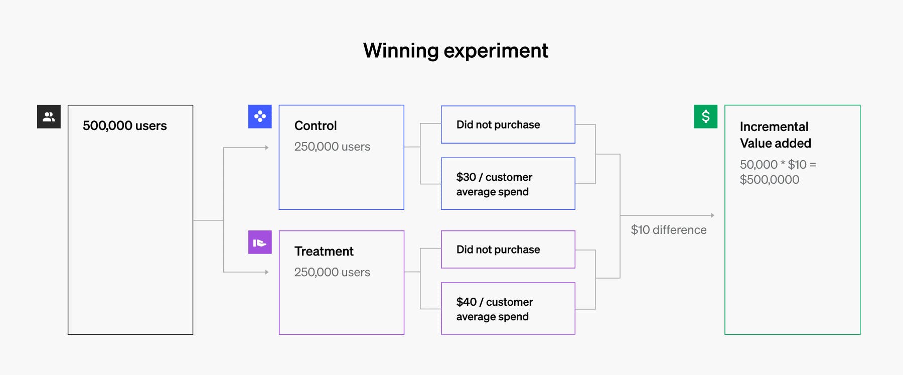 - 50,000(treatment) purchases * $10 = $500,000 – incremental value driven by treatment