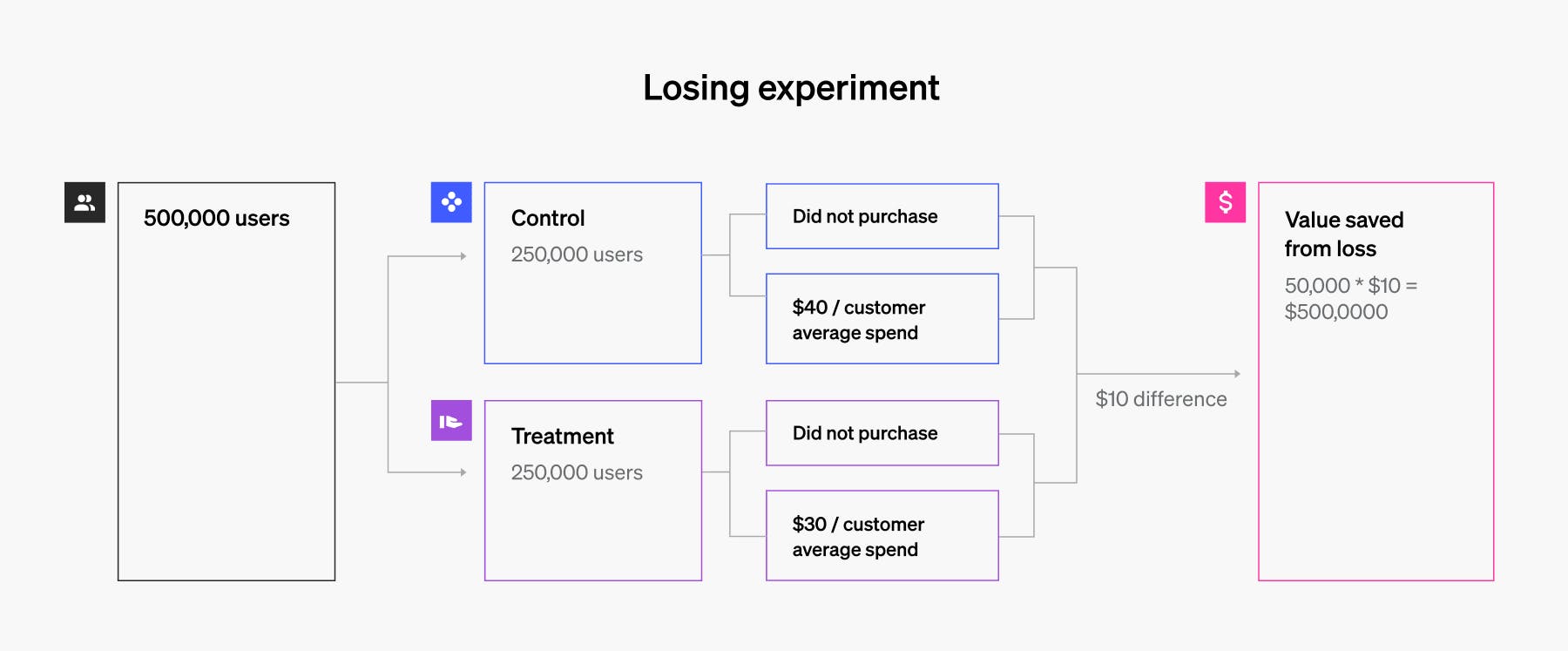 - 50,000(control) purchases * $10 = $500,000 – saved by having 50% in our control