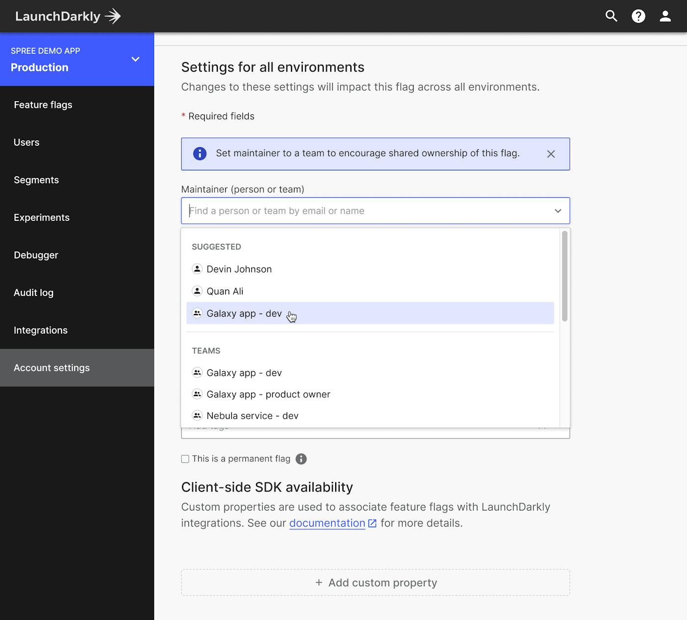 We recognize the importance of designated flag maintainers for accountability and flag health. In addition to individual members assigned as flag maintainers, we also support the ability to assign entire teams as flag maintainers. This offers the additional benefit of shared accountability and also ensures that when one member leaves the team, the flag still has other owners.