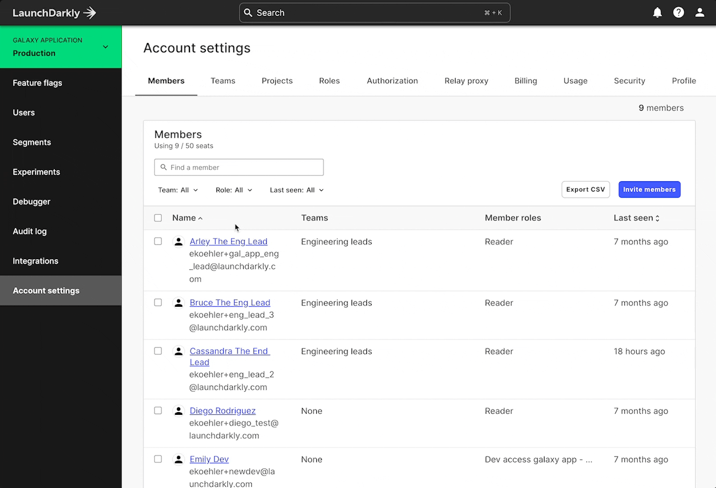 Admins on Enterprise accounts can now edit multiple account members at a time by adding the members to teams or replacing their member roles. This will make it faster and easier to start building teams in your LaunchDarkly account!