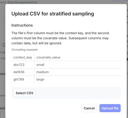 - When designing your experiment, indicate that you will use stratified sampling and upload your CSV file.