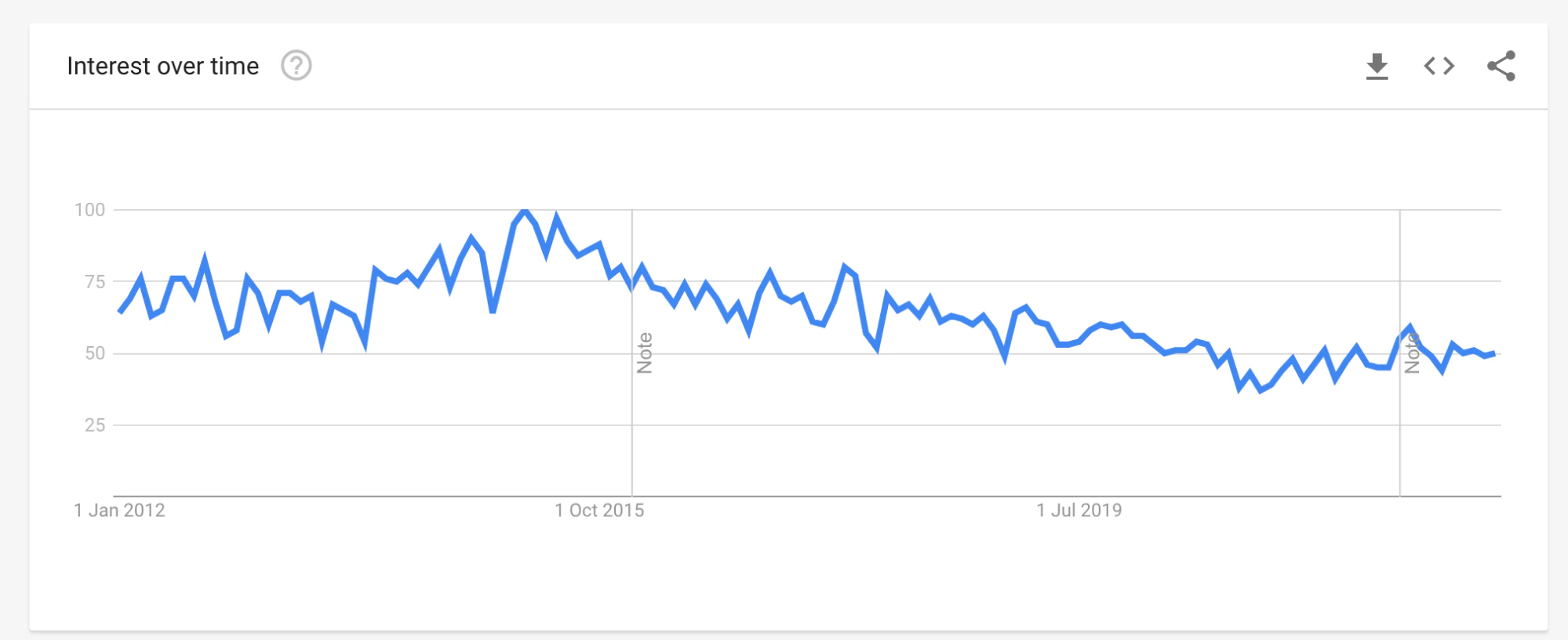 Release management is much less of a topic of discussion than it used to be. Google Trends data for the past decade show that global interest in release management peaked around 2015 and has been declining steadily since.