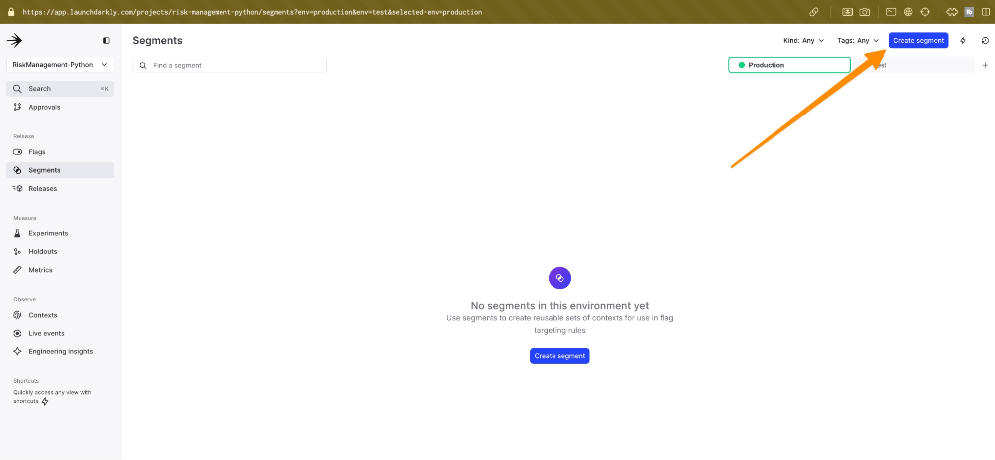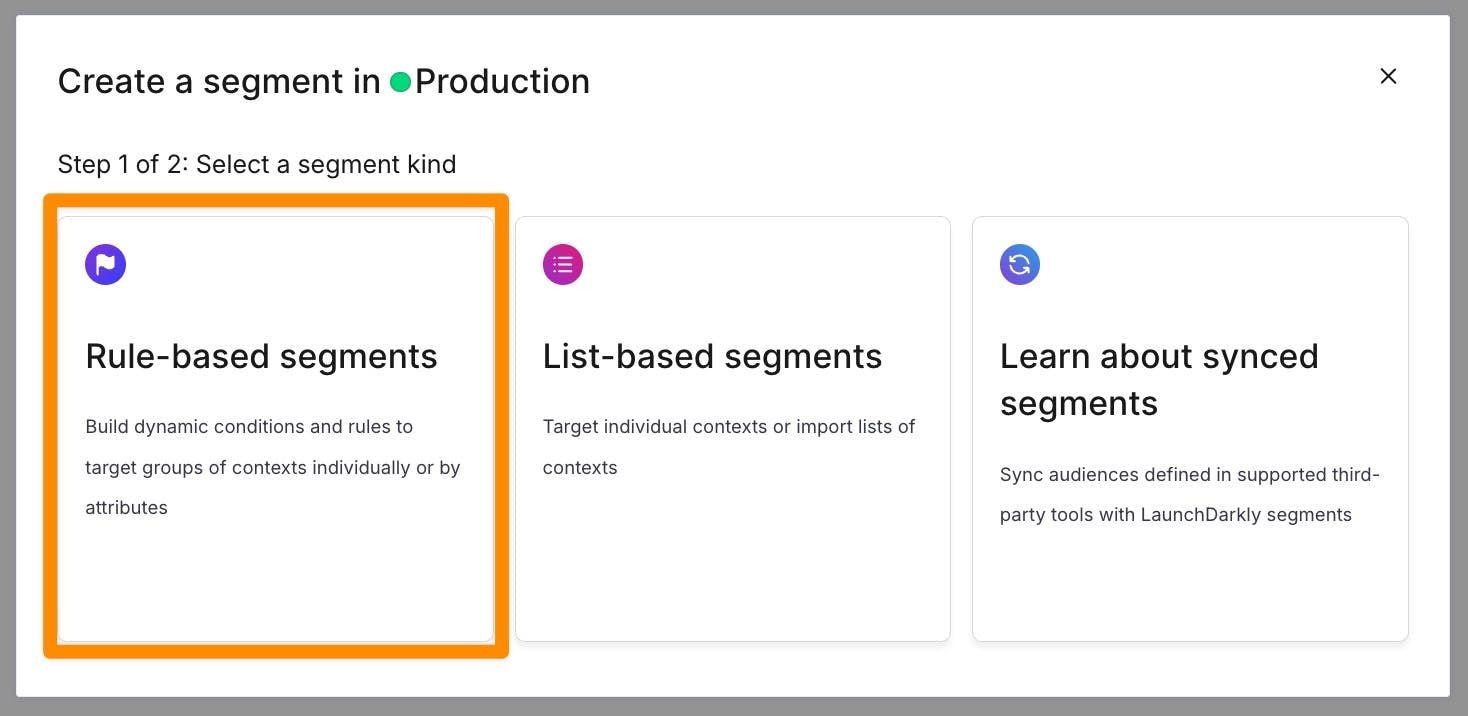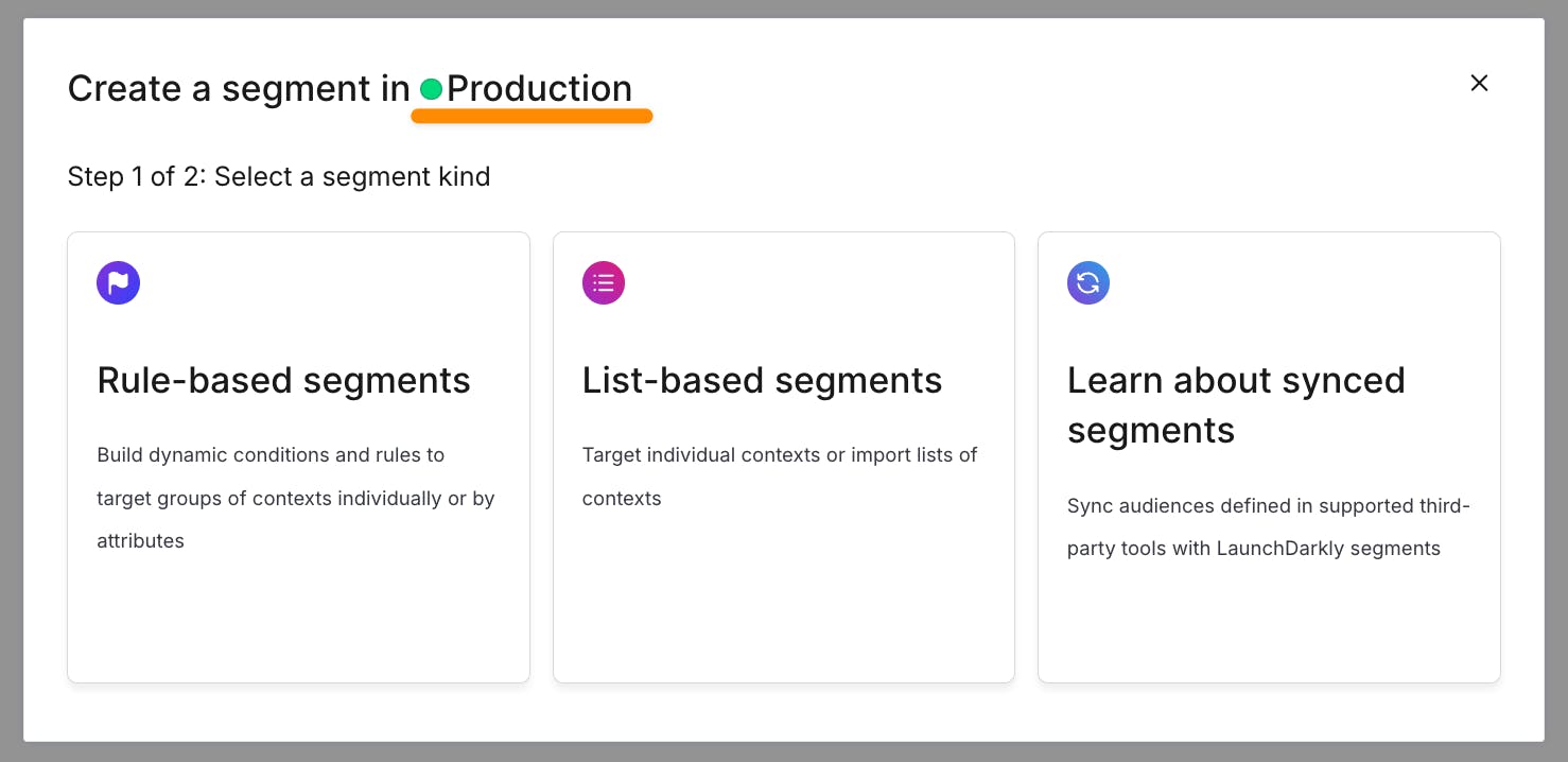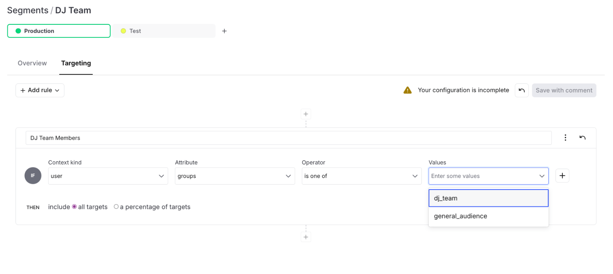 Segments can be shared across LaunchDarkly environments, making it more accessible to keep things in sync between dev/test and production. Let’s create a segment, add targeting rules to it, and then use it in a flag.