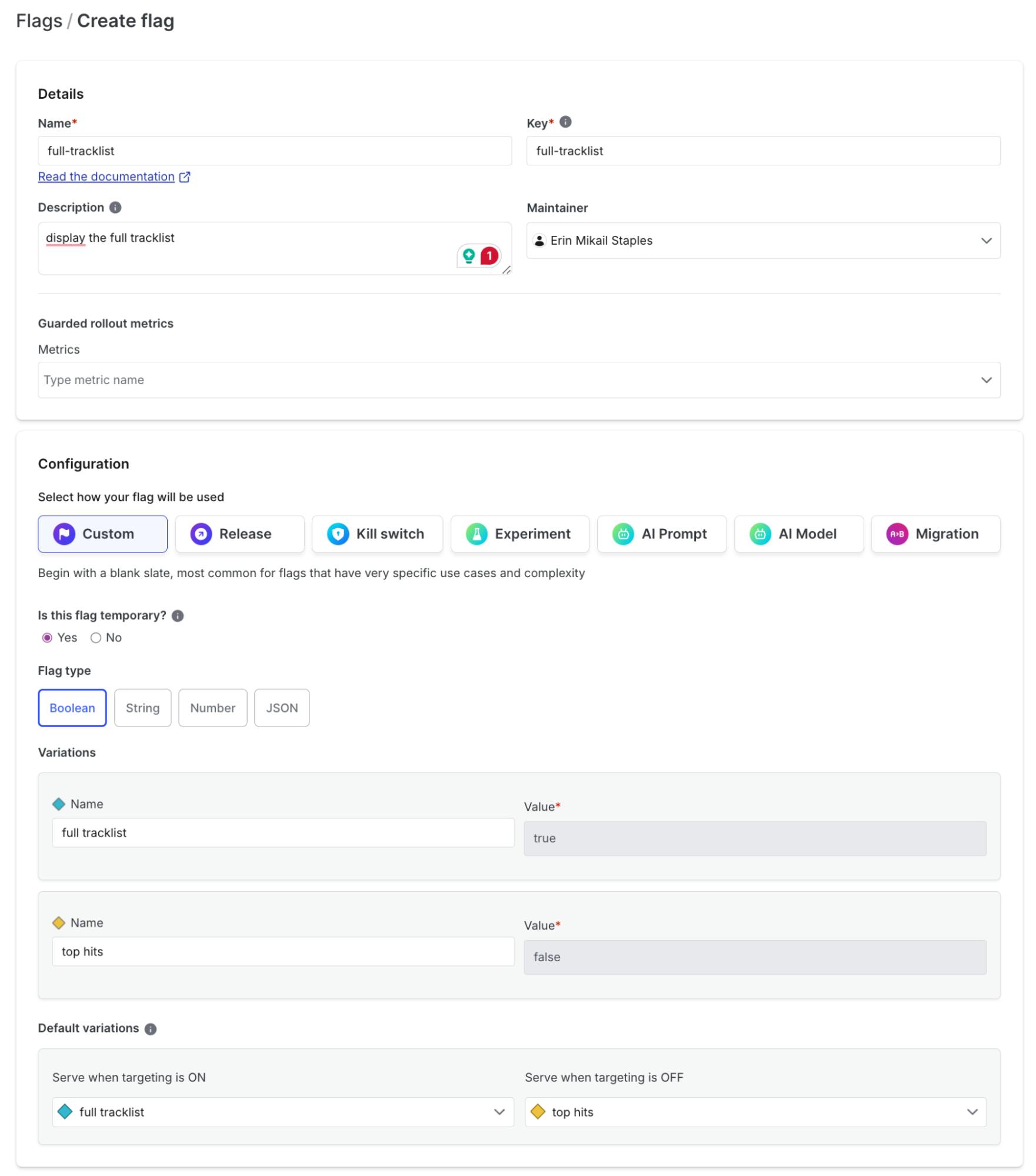 Name this flag “full-tracklist” and match the flagKey variable in your application code. The key will auto-populate. Click the “Create flag button” when you’re done typing the name and description.